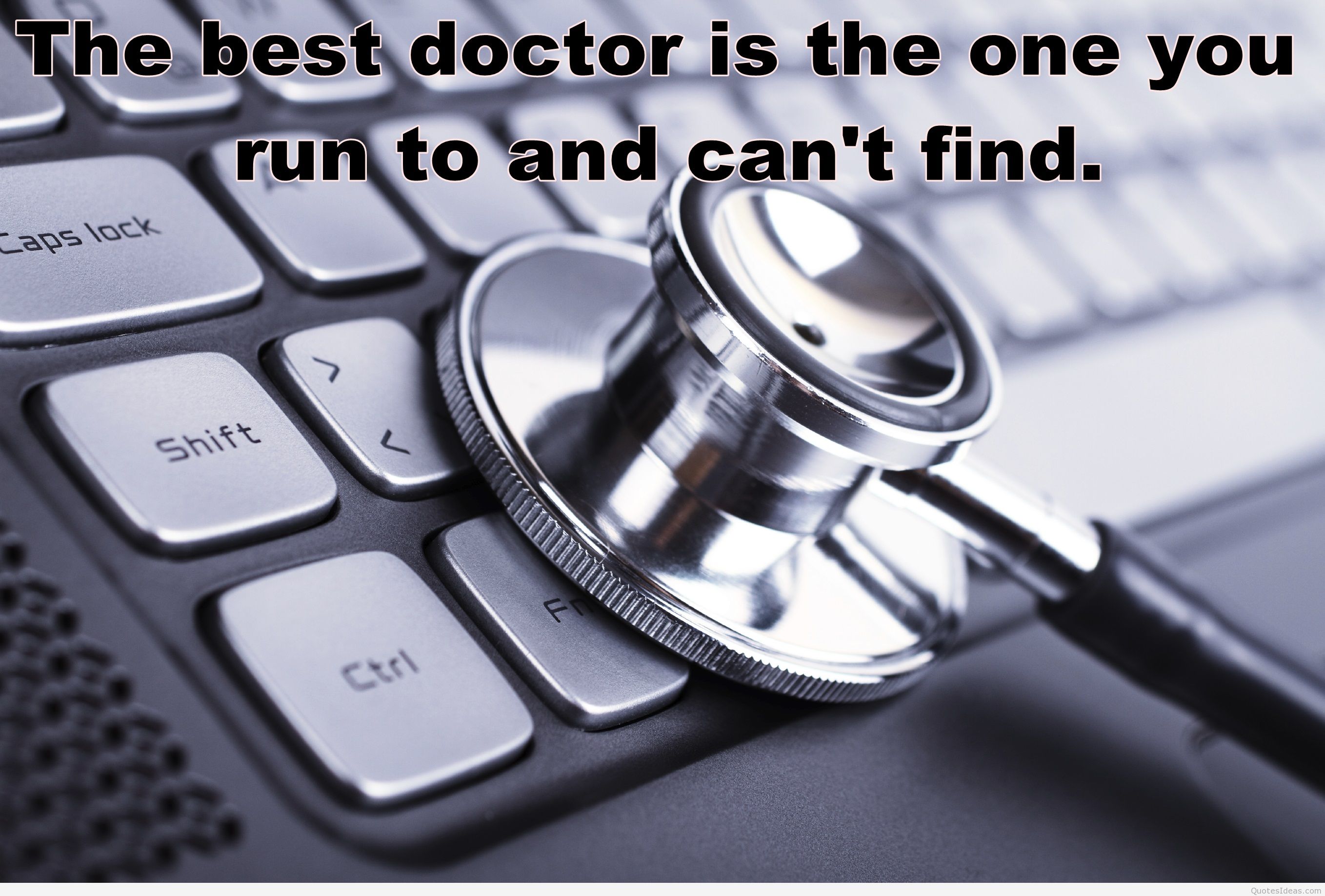 Description: A stethoscope resting on top of a keyboard with a quote about the best doctor is the one you run to and can't find.