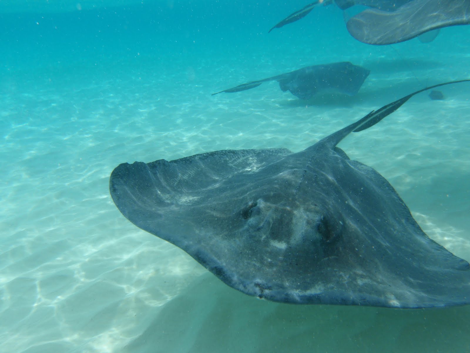 Description: A stingfish swimming in the ocean with a lot of fish around it's neck and head.