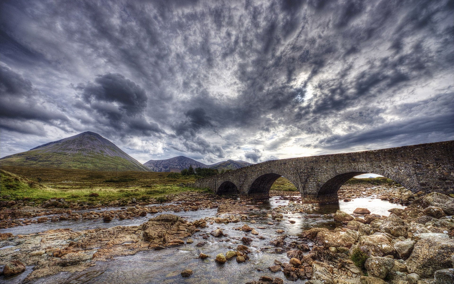 Description: A stone bridge over a river with a mountain in the background and clouds in the sky above it.