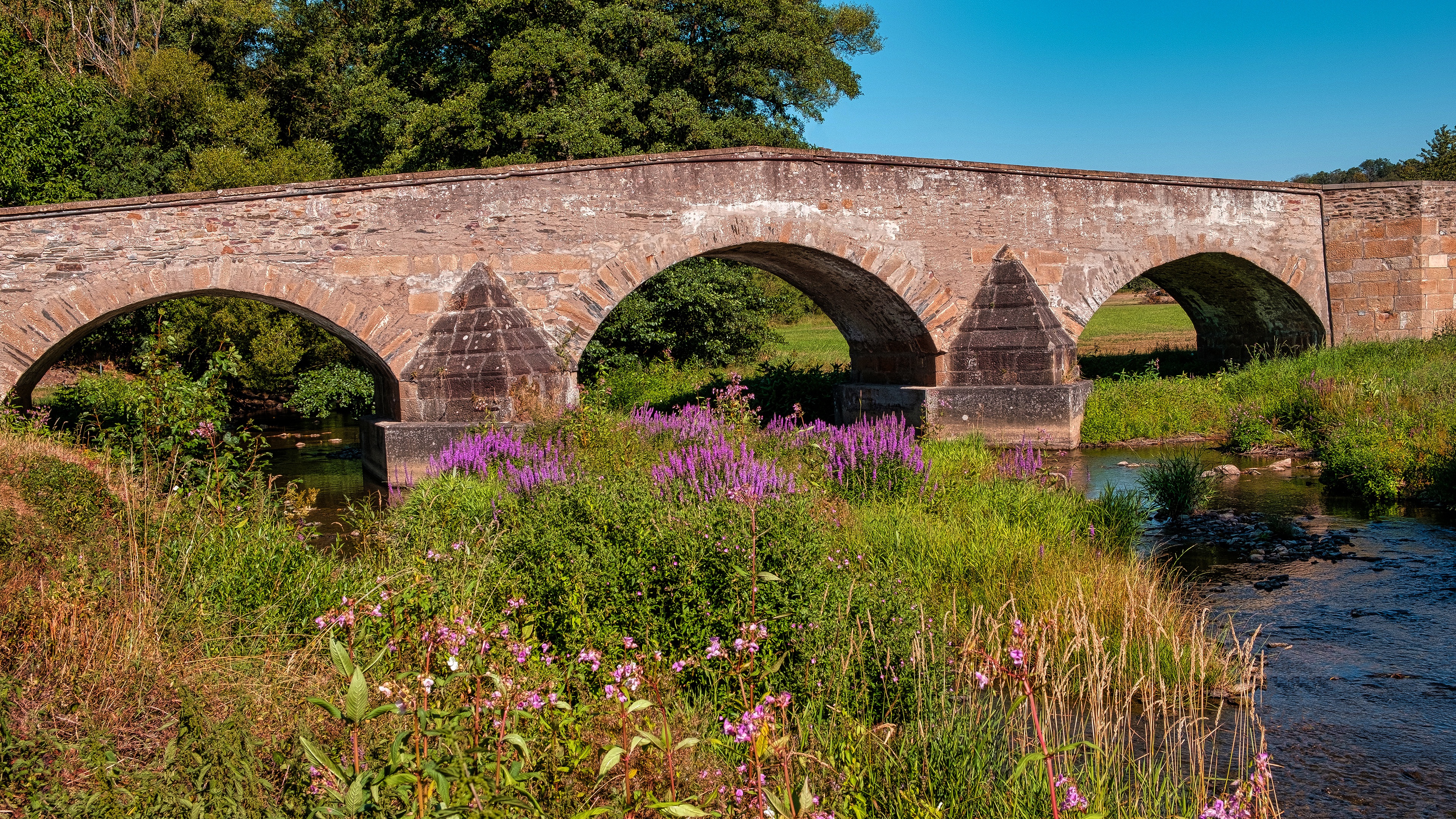 Description: A stone bridge over a river with purple flowers growing on the bank and a few trees in the background.