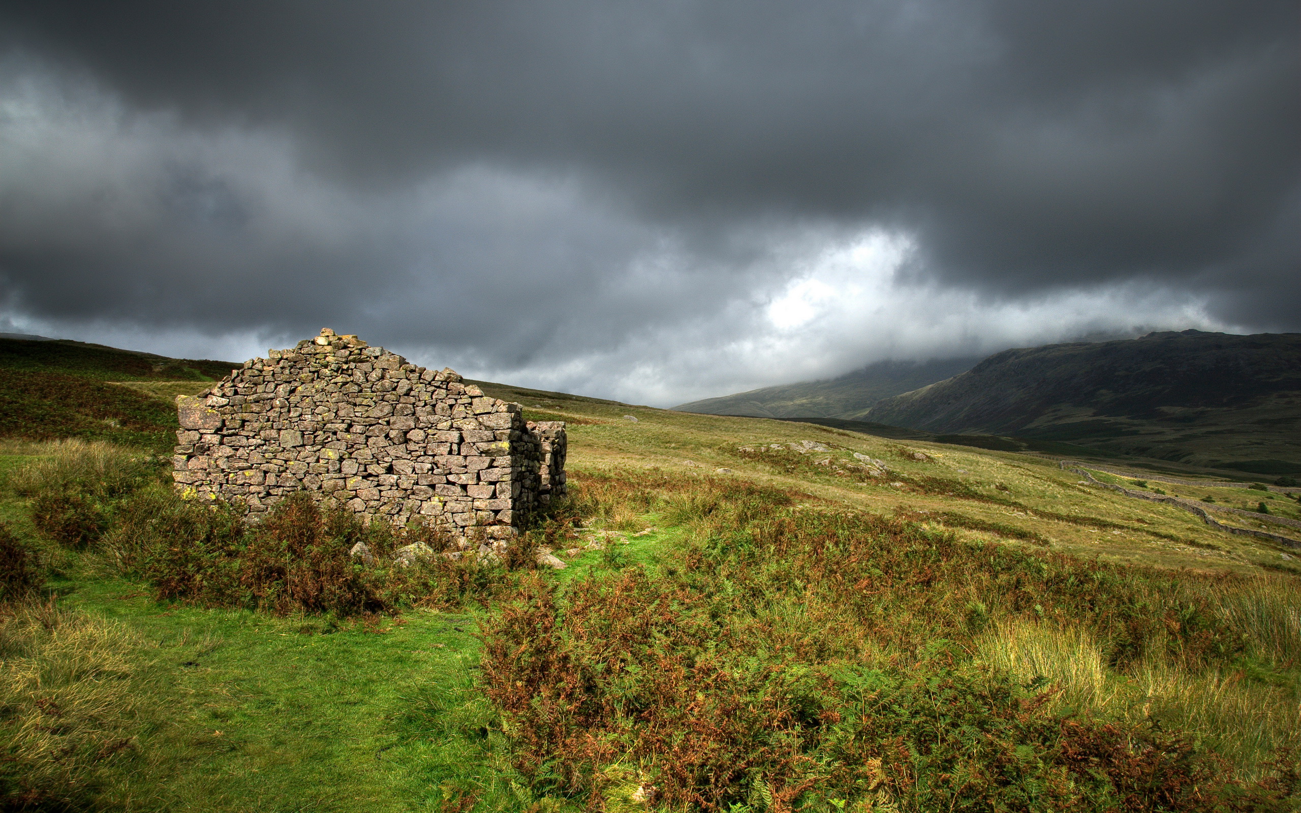 Description: A stone building in a grassy field under a cloudy sky with mountains in the background and a field of grass and bushes.