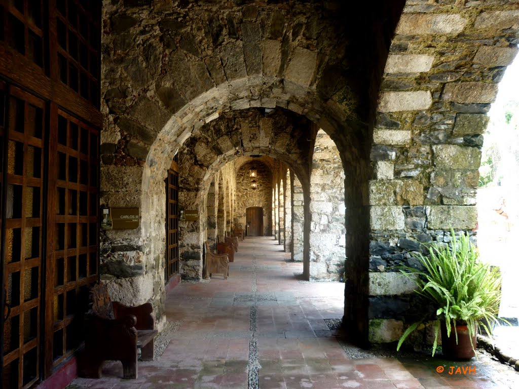 Description: A stone building with a long hallway between two buildings with doors and a bench on the side of the building.