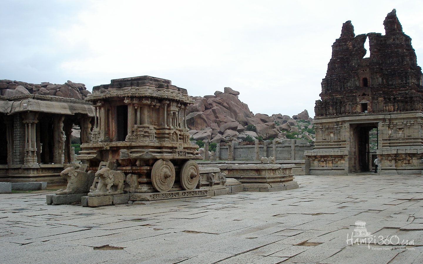 Description: A stone structure with a wheel on the ground in front of it and a rock formation behind it in the background.