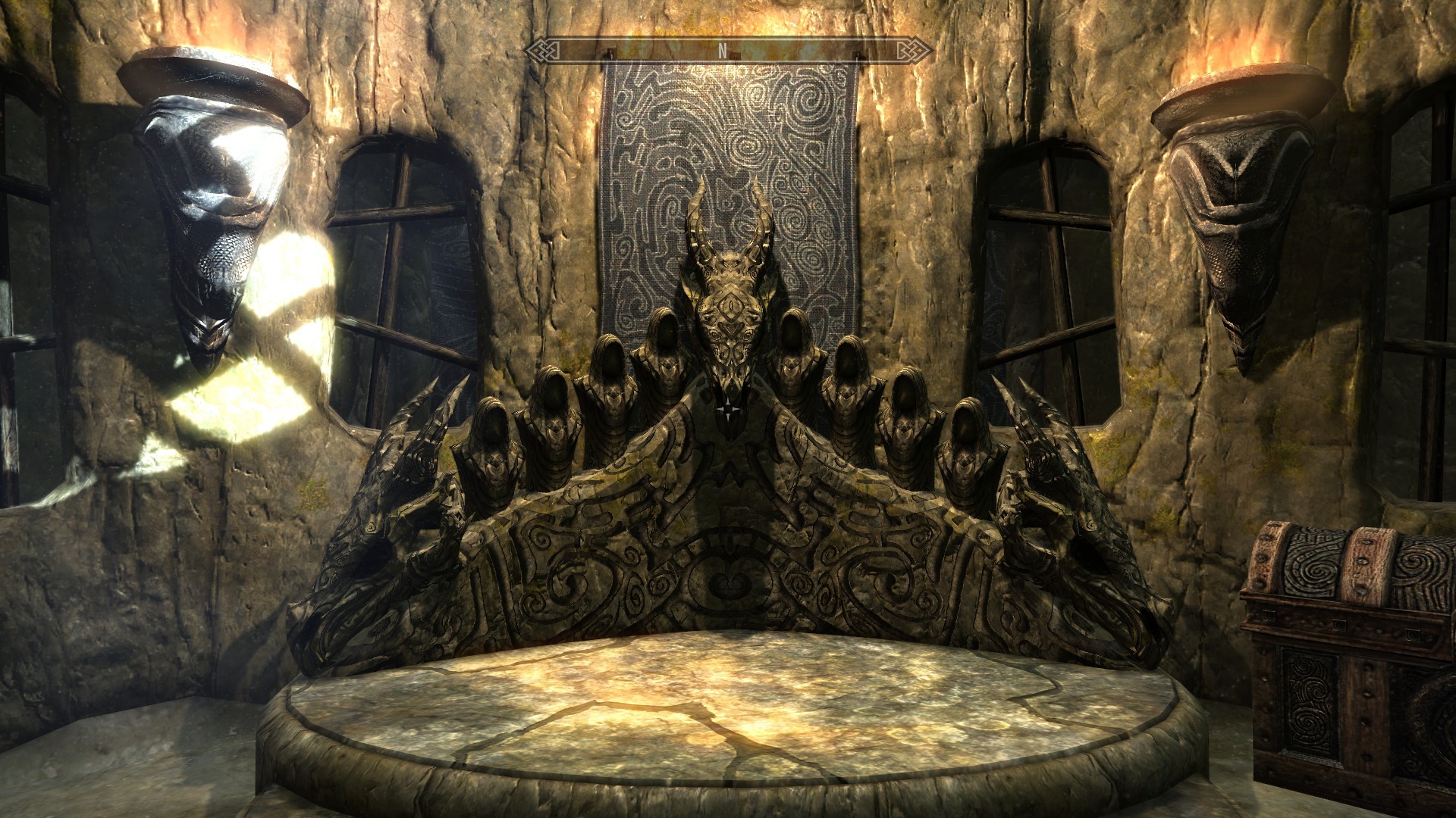Description: A large stone throne in a stone room with a window and a door in the background and a clock on the wall.