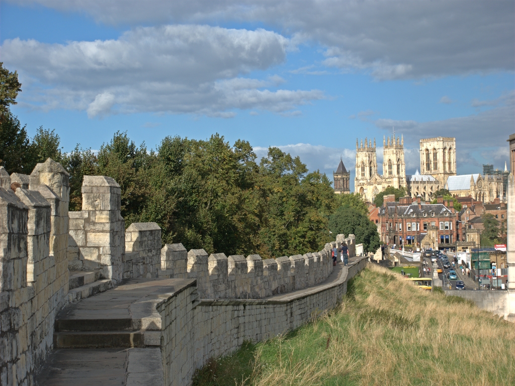 Description: A stone wall with a view of a city and a castle in the background with a cloudy sky above.