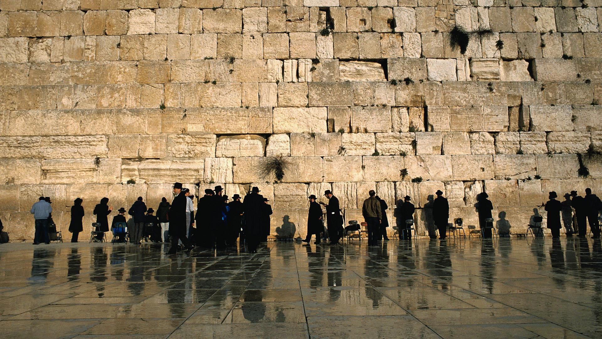 Description: A group of people standing in front of a stone wall with a large opening in it's middle.