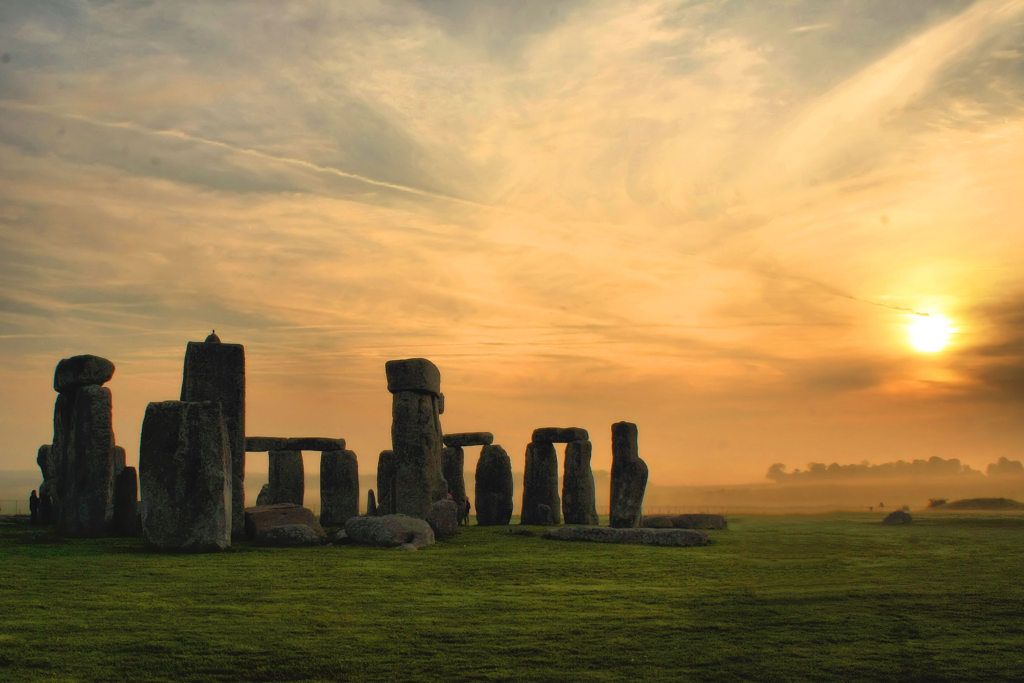 Description: A group of stonehenges in a field with the sun setting behind them and a few clouds in the sky.