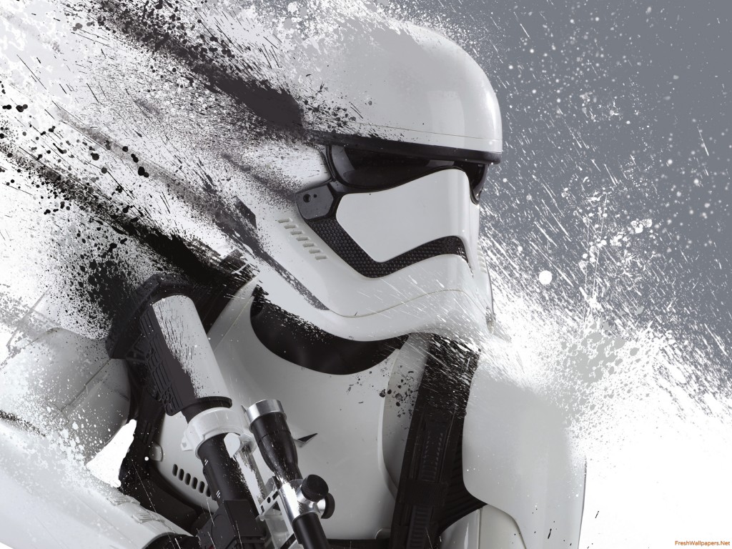 Description: A storm trooper is holding a gun in his hand and wearing a helmet with a spray of water on it.