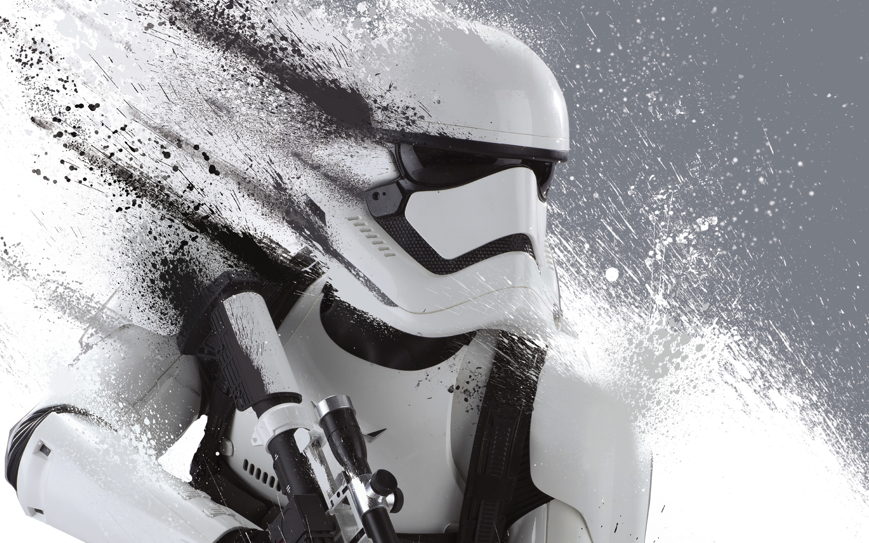 Description: A storm trooper holding a gun in his hand and spraying water all over his face with his hands and body.