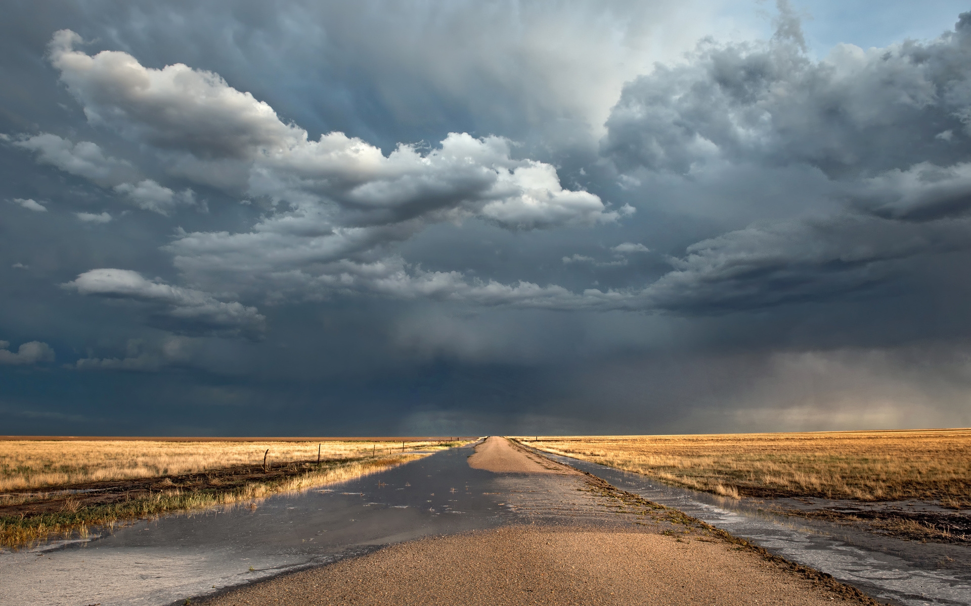 Description: A road with a puddle of water on the side of it under a cloudy sky with storm clouds above.