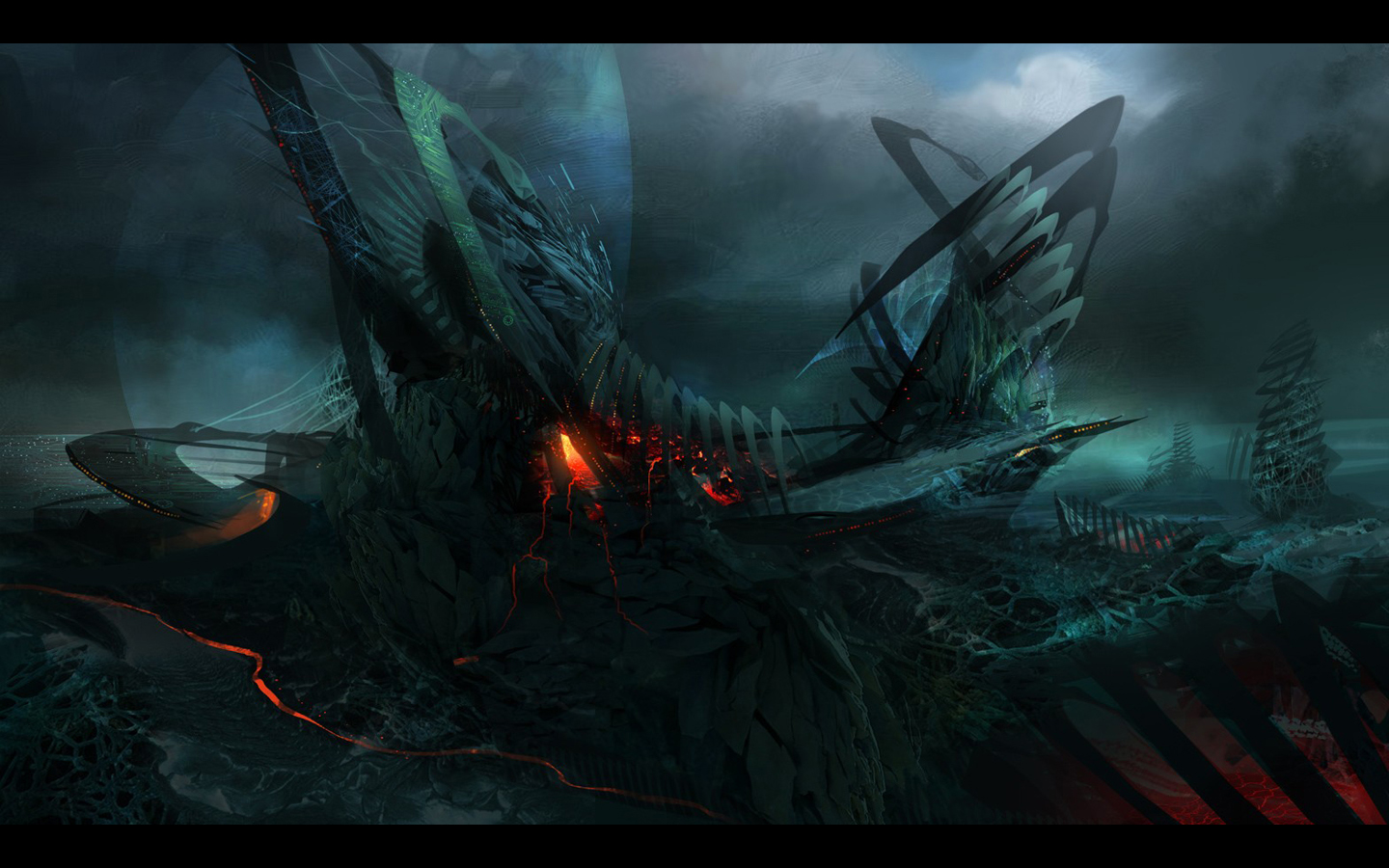 Description: A painting of a strange looking creature in the dark night sky with a red light coming from its mouth.