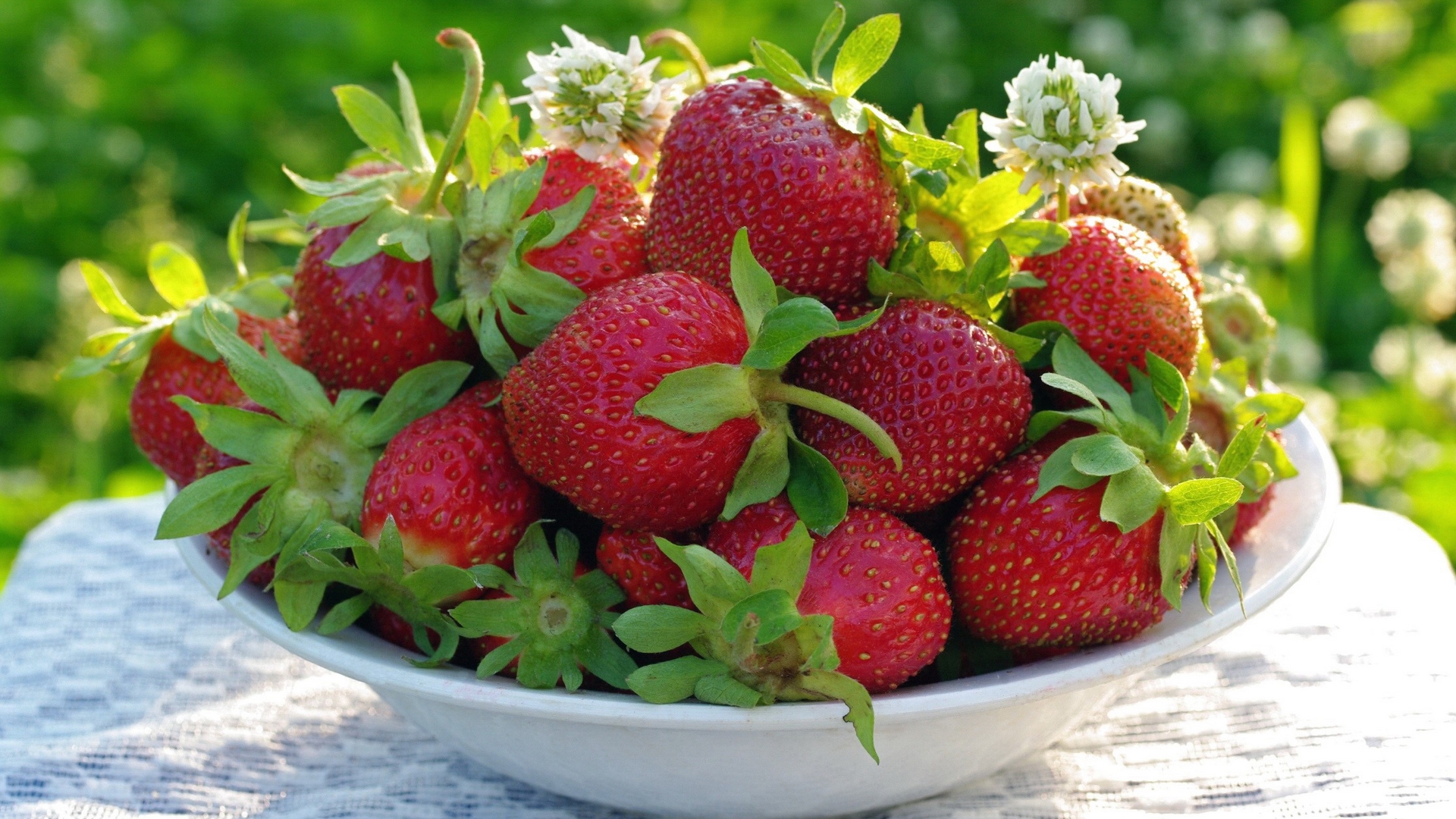 Description: A bowl of strawberries on a table outside in the sun with a cloth on it and a green background.