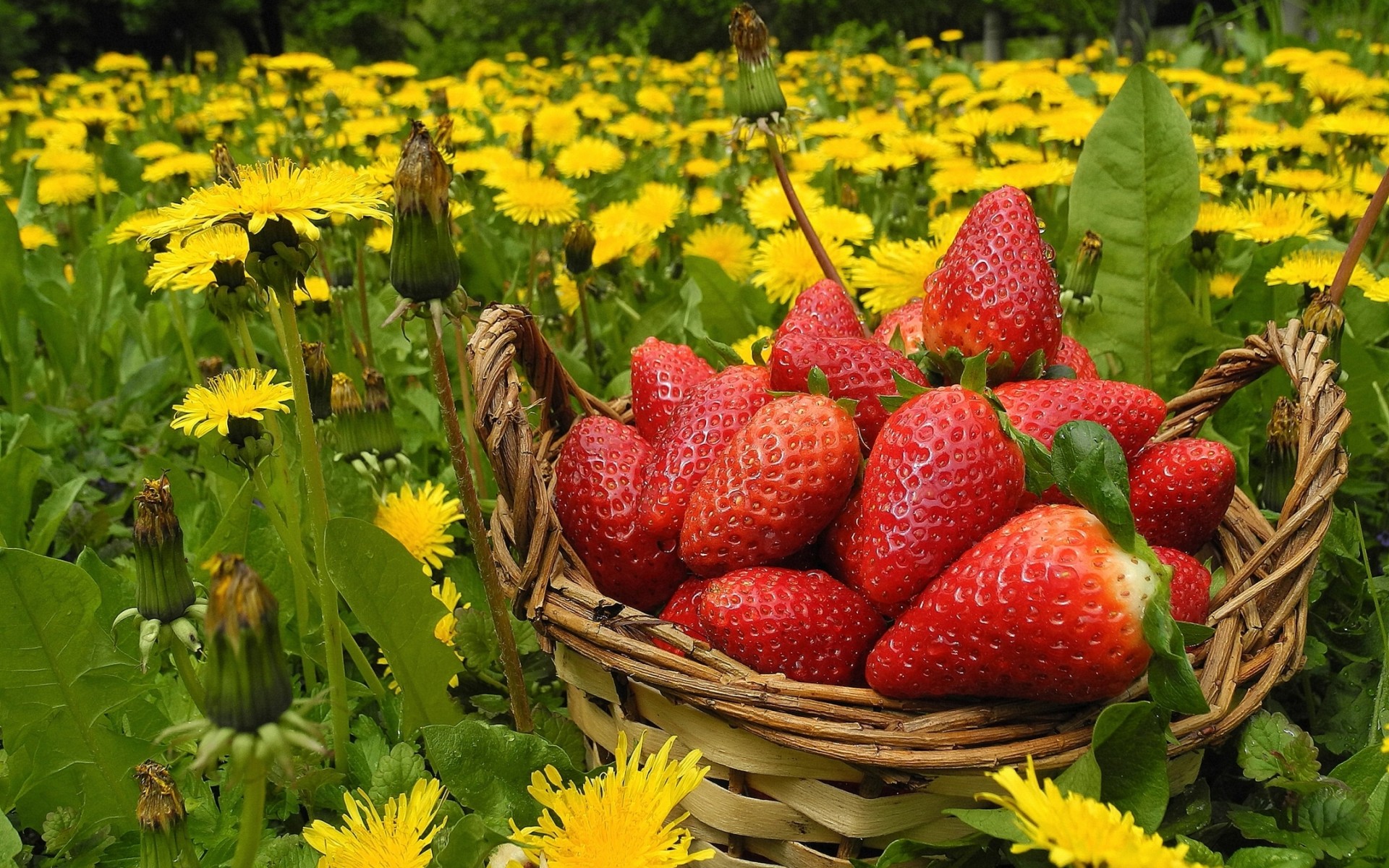 Description: A basket of strawberries in a field of dandelions and dandelions in the background is a field of yellow flowers.