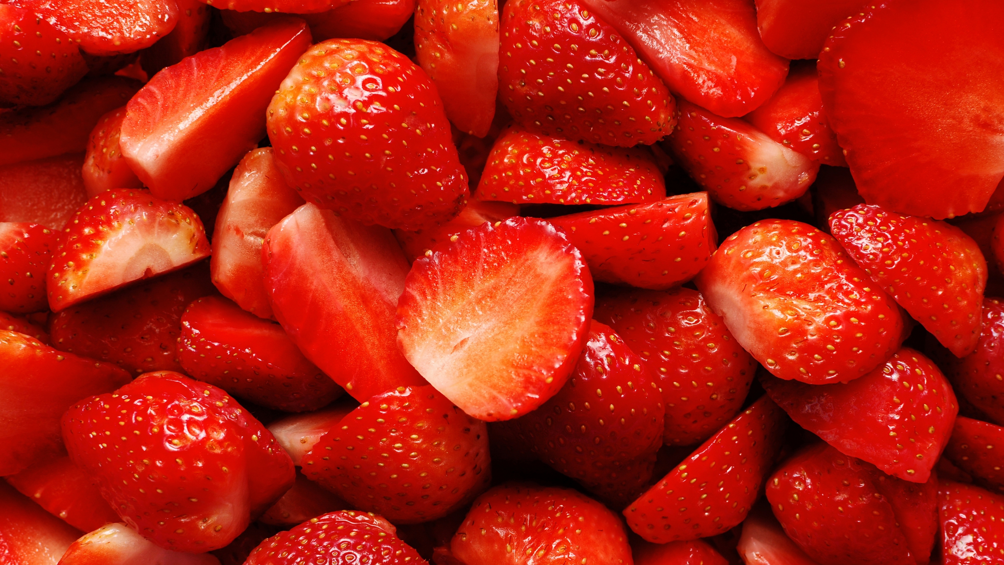 Description: A close up of a pile of strawberries with water droplets on them and a red background with a white border.