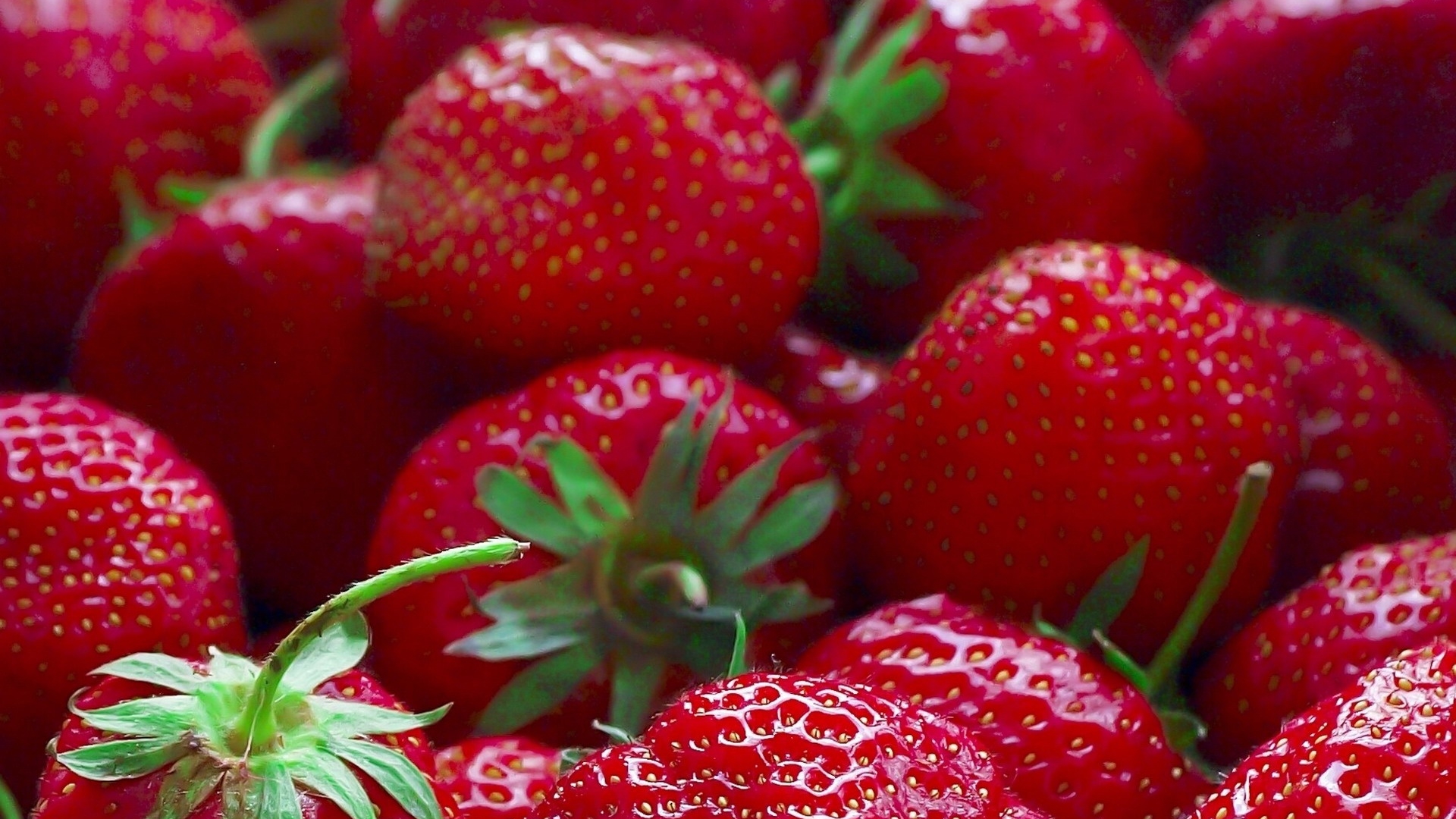 Description: A close up of a bunch of strawberries with drops of dew on them.
