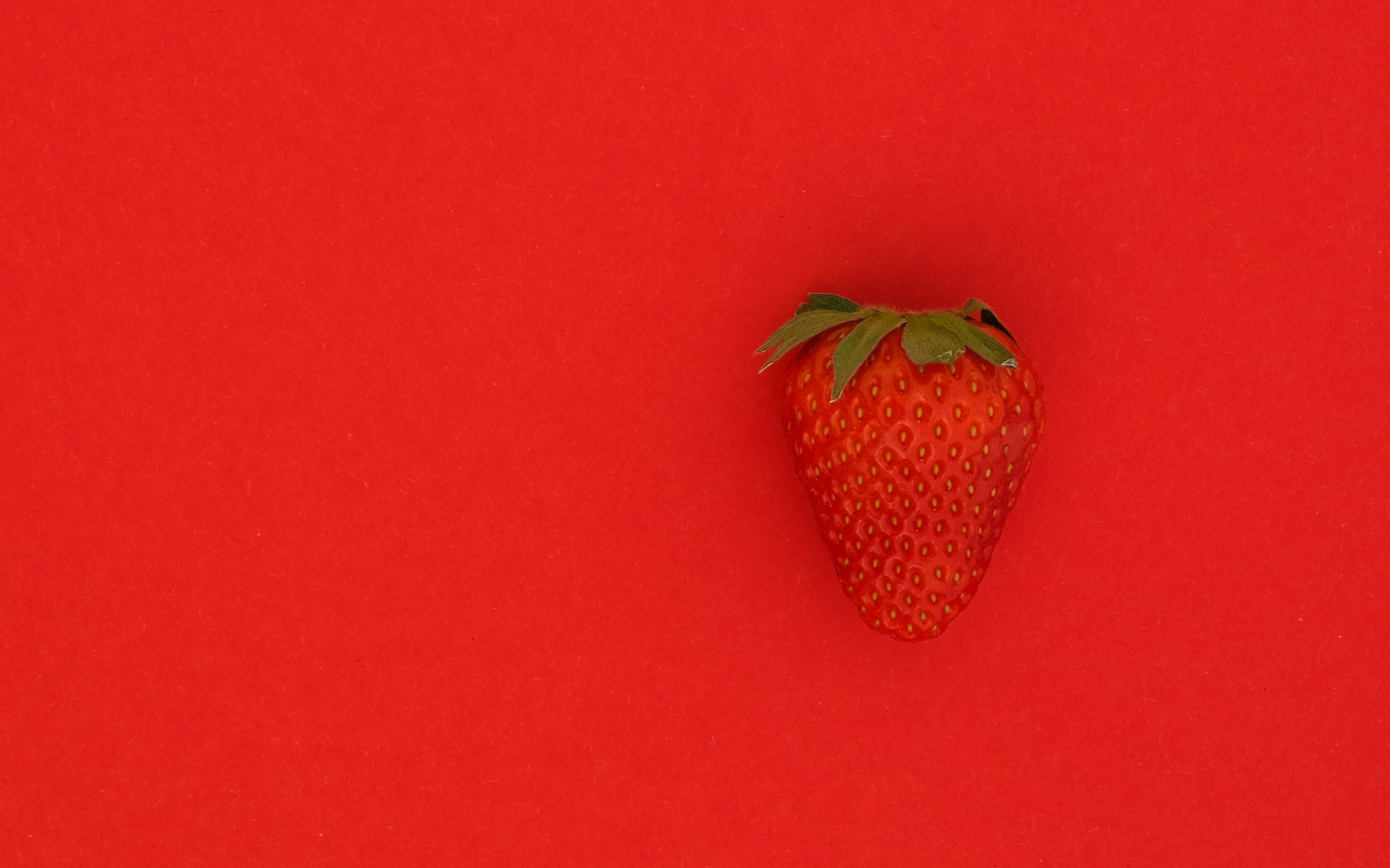 Description: A single strawberry on a red background with a green stem on it's side.