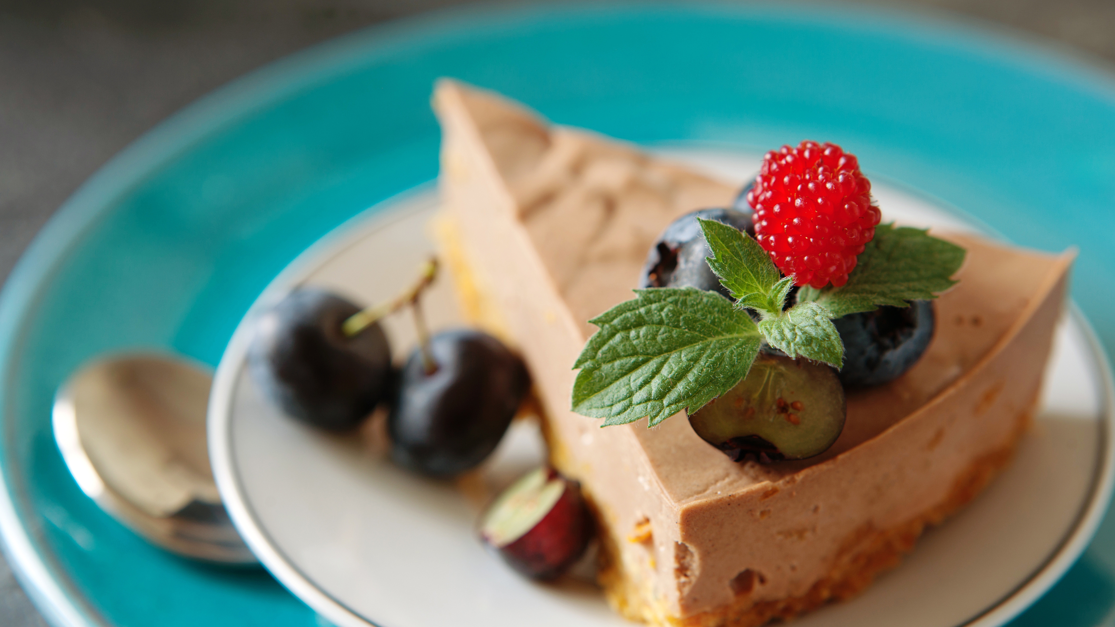 Description: A piece of cake with a strawberry on top of it on a plate with a spoon and a spoon.
