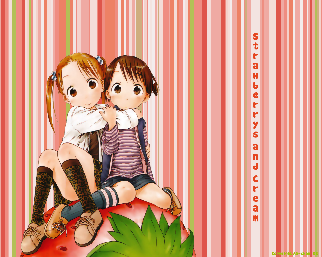 Description: A couple of people sitting on top of a strawberry on a striped background with a green leaf in the foreground.
