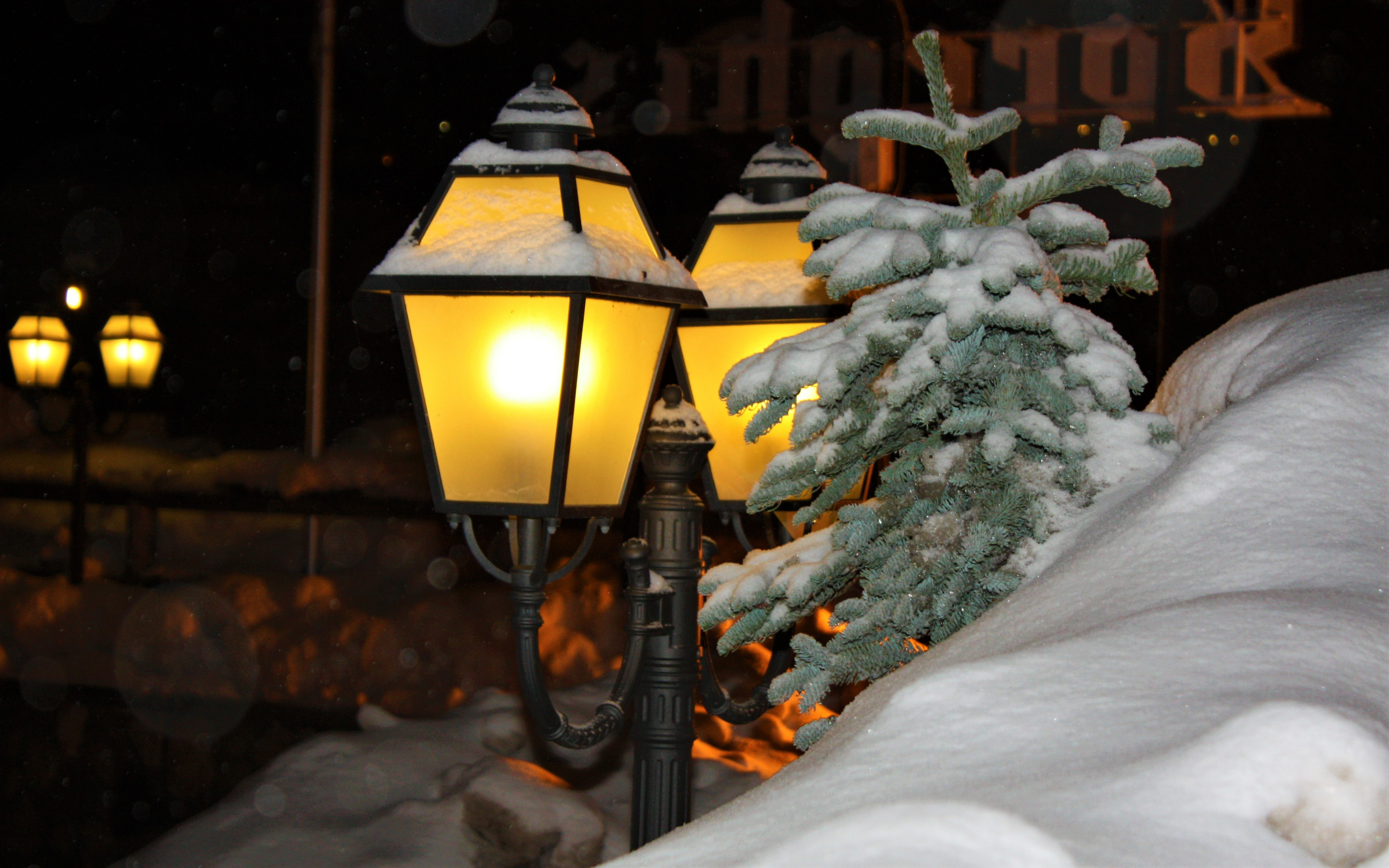 Description: A street light covered in snow next to a tree and a building sign at night time with snow on the ground.