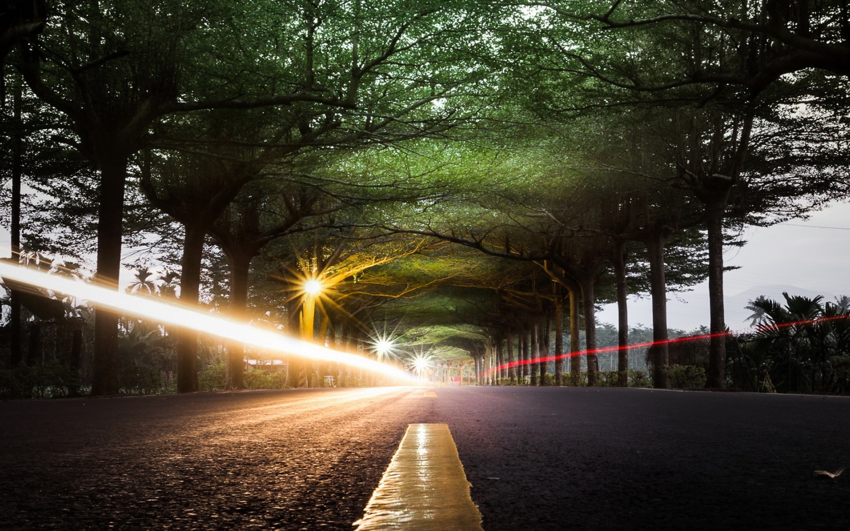 Description: A street with a light shining through the trees on it and a yellow line going through the road to the right.