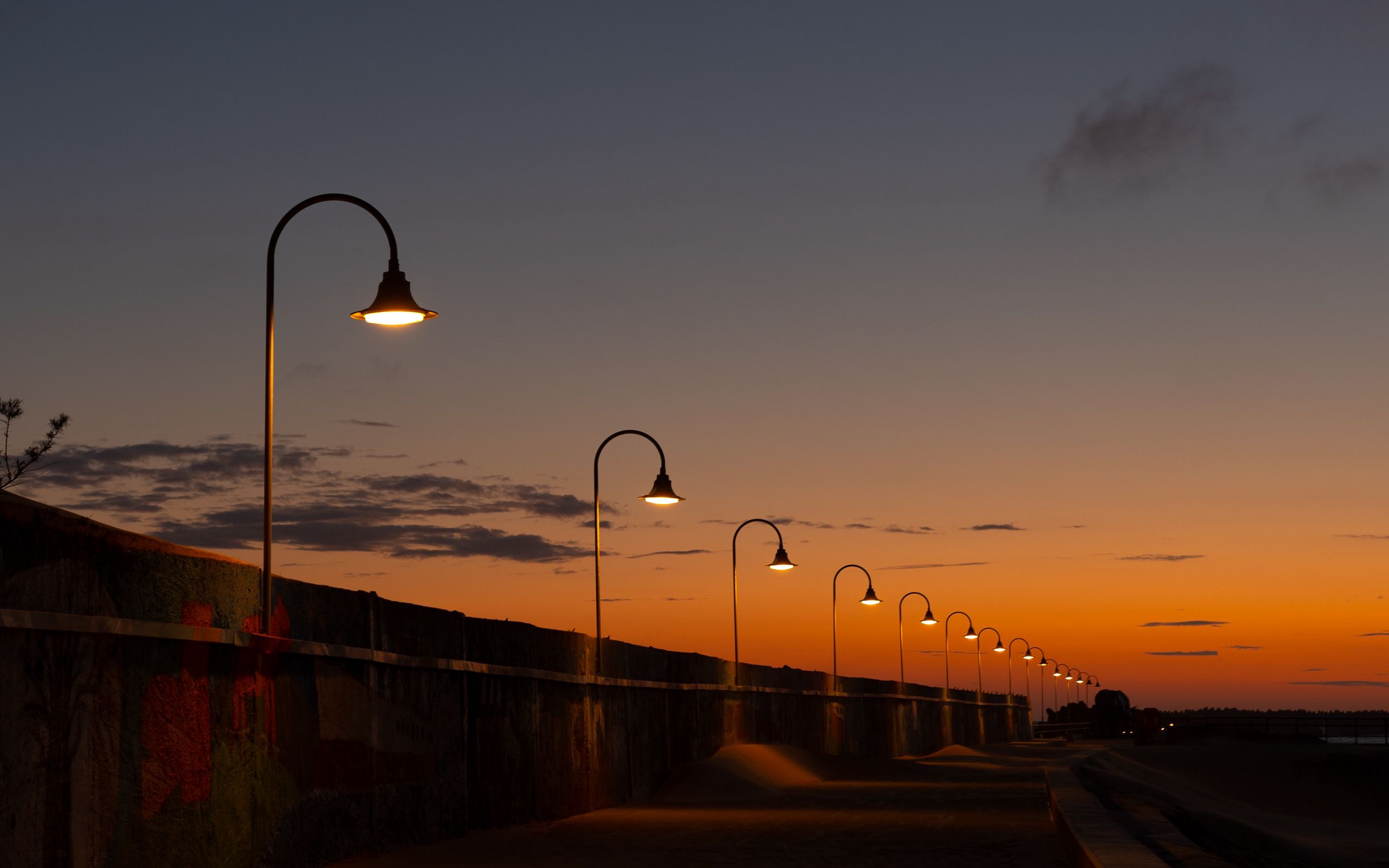 Description: A row of street lights next to a wall at sunset with clouds in the sky above it and a wall with a concrete wall and a light pole.