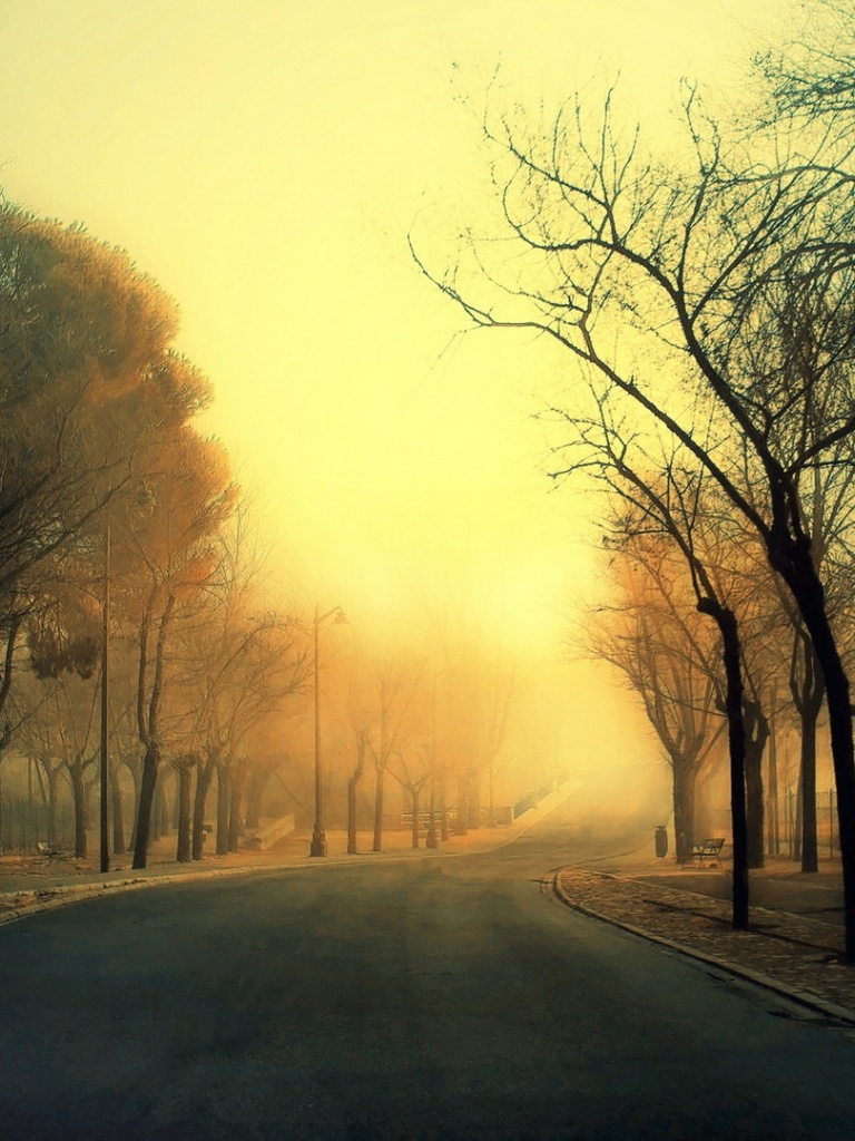 Description: A street with trees and a yellow sky in the background with a foggy street and trees on both sides.