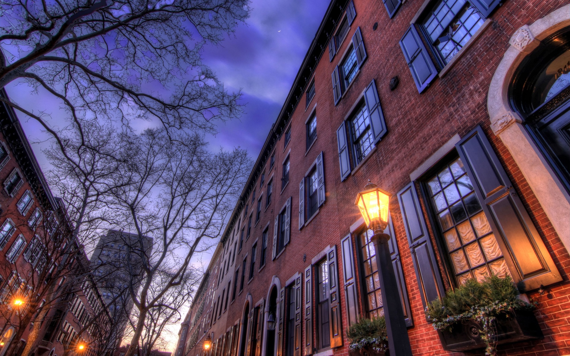 Description: A street light is lit up in the evening sky near a brick building with windows and a tree in the foreground.