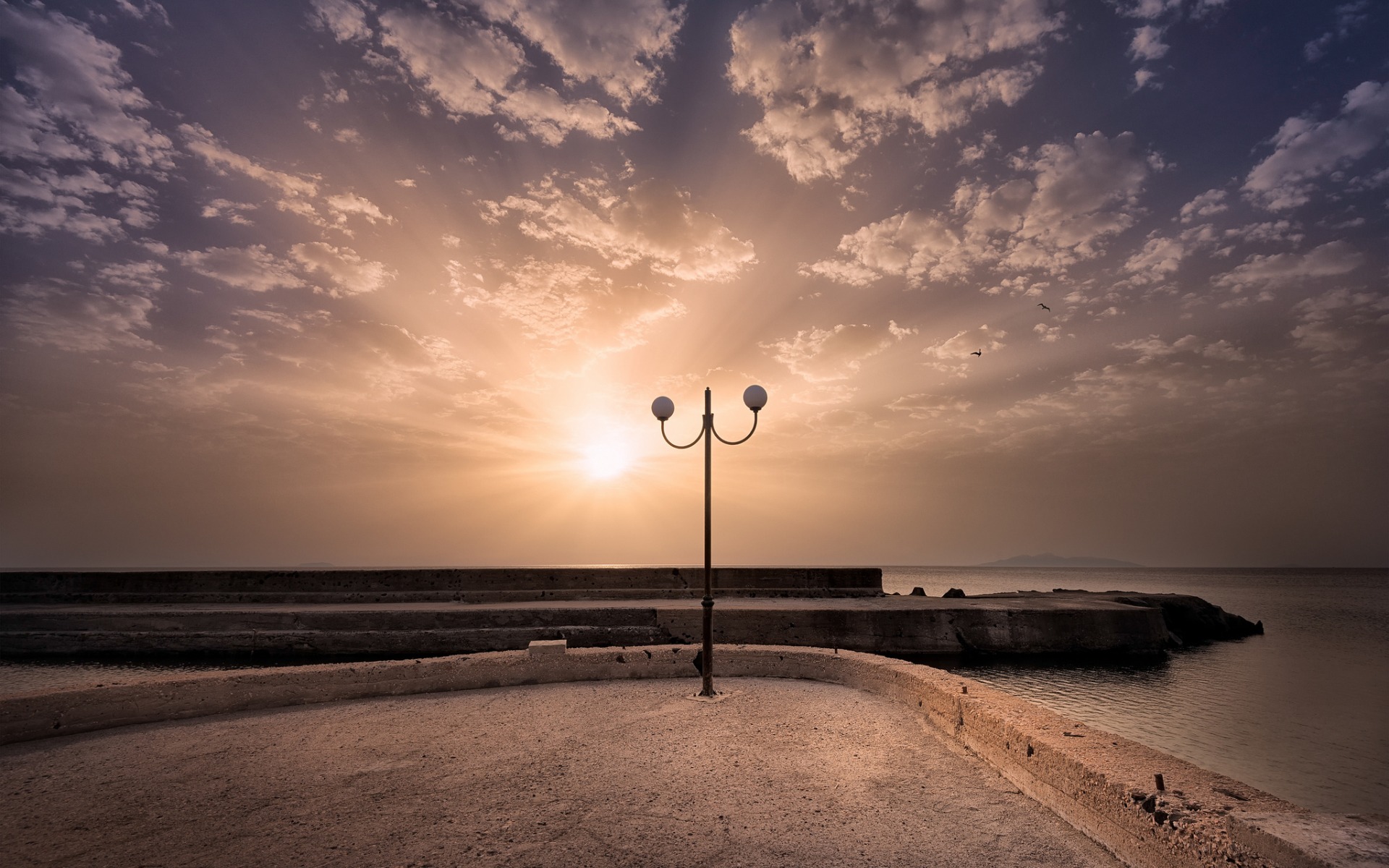 Description: A street light sitting on the side of a road near the ocean at sunset or dawn with a cloudy sky.