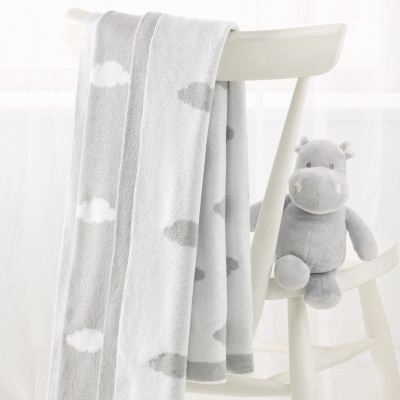 Description: A stuffed animal sitting on a chair next to a blanket and a stuffed animal on a chair next to a window.