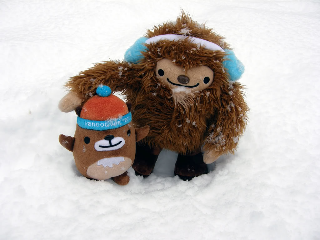 Description: A stuffed animal and a stuffed animal are in the snow together.