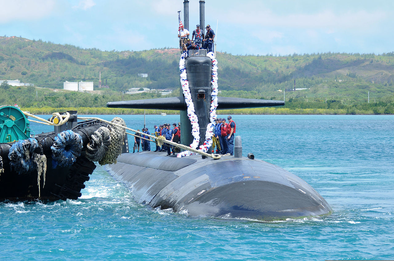 Description: A submarine is in the water with people standing on it and a boat in the water behind it and a boat in the water.