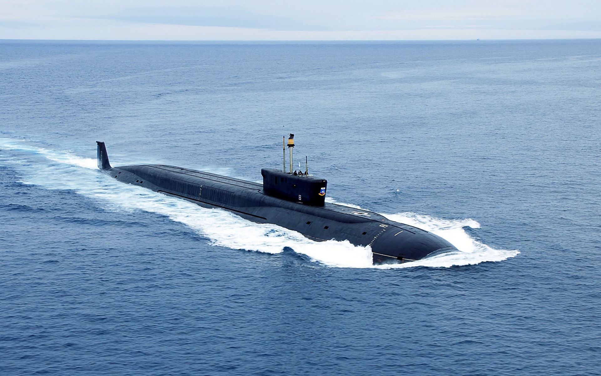 Description: A submarine is in the middle of the ocean water and is moving fast through the water.