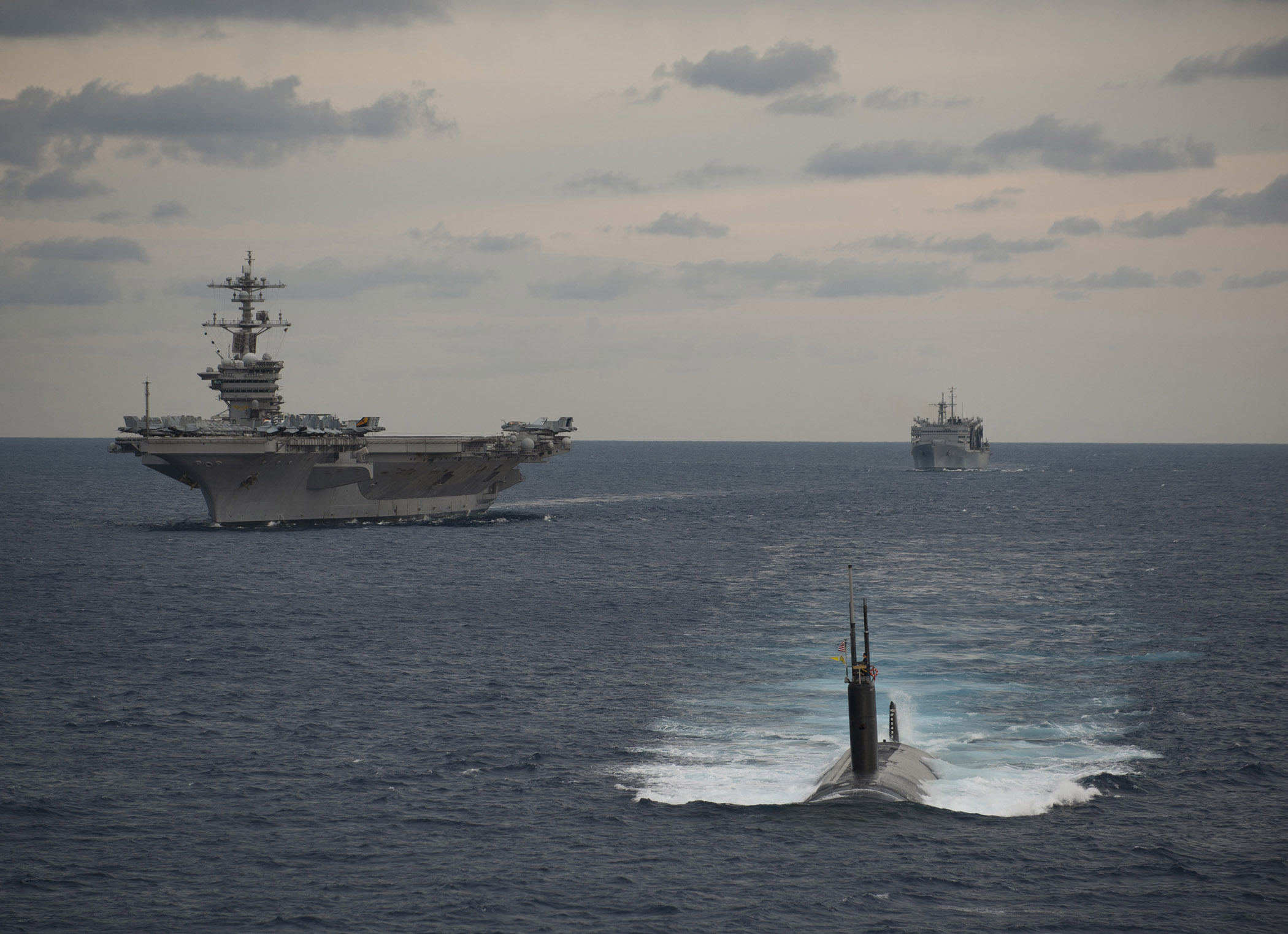 Description: A submarine and a ship in the ocean together in the day time scene with clouds in the sky and a few ships in the water.