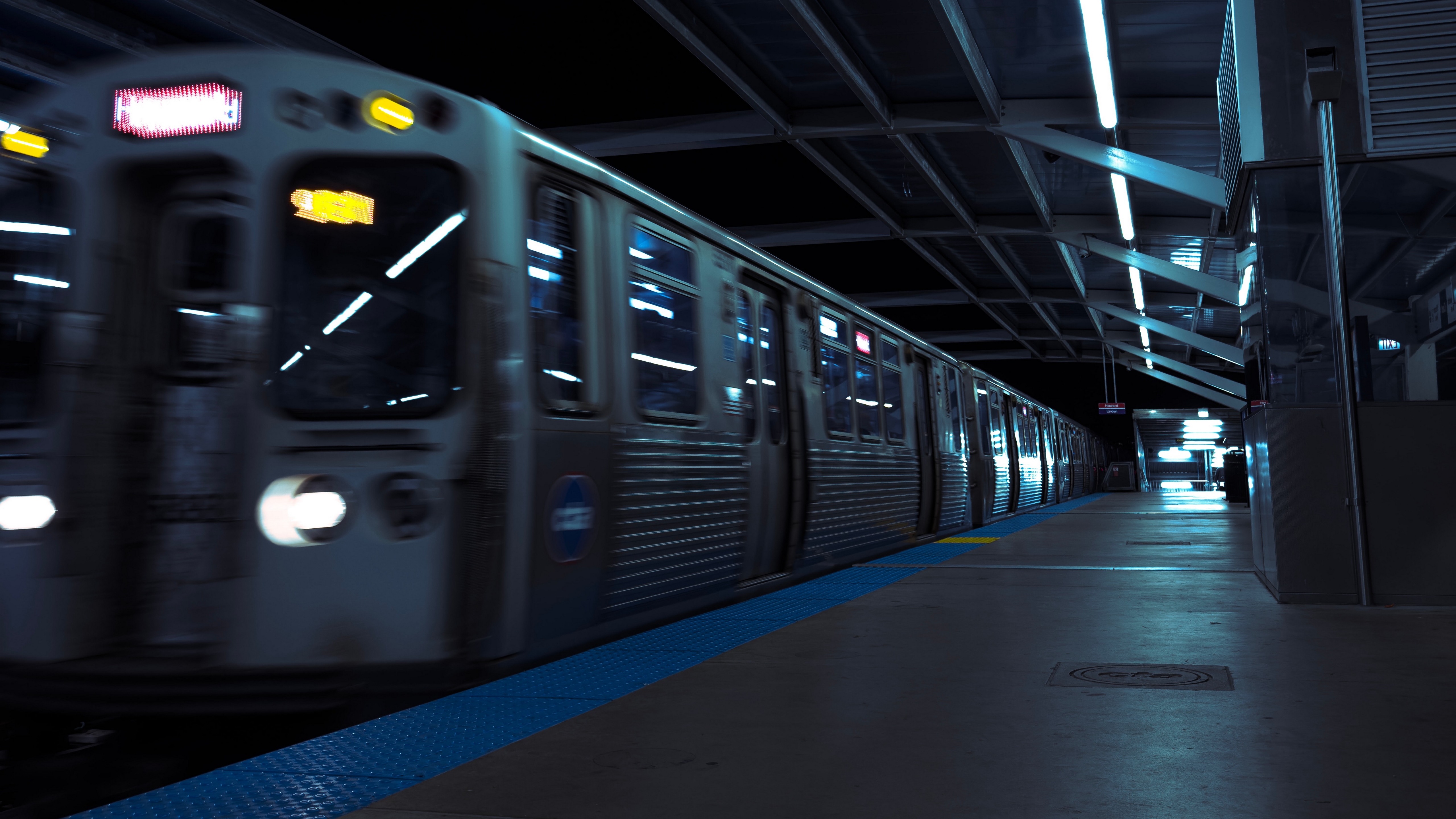 Description: A subway train is moving through a station at night time.