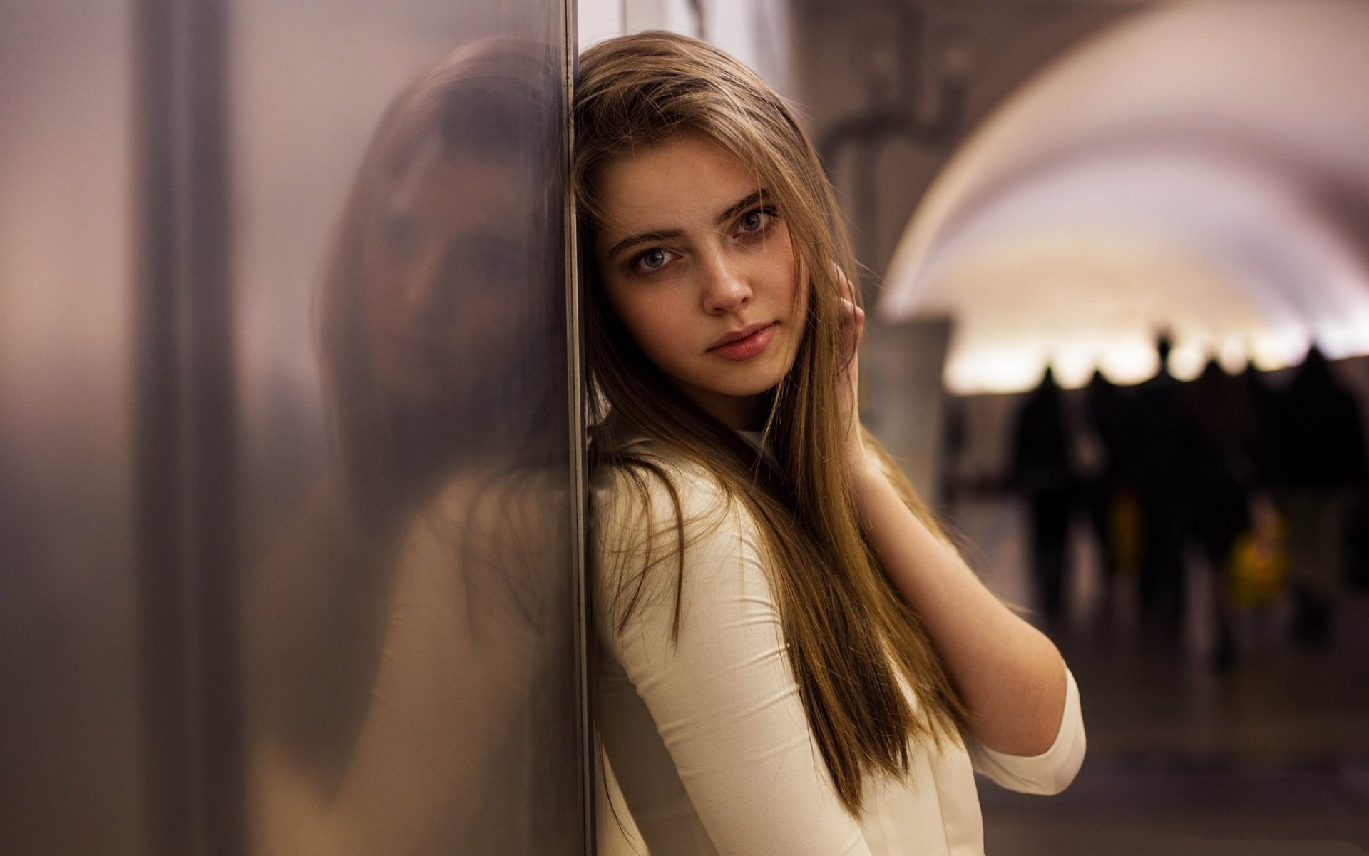 Description: A woman leaning against a wall in a subway station.