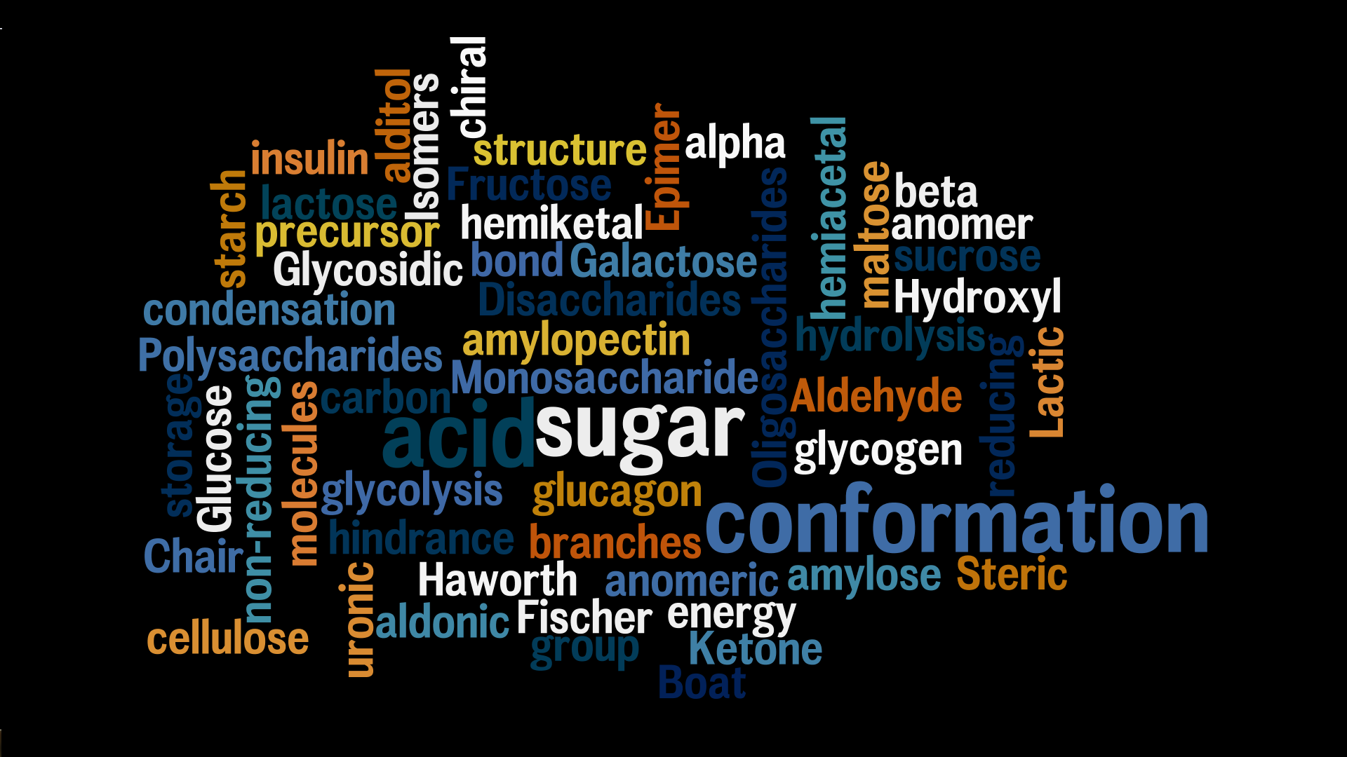 Description: A word cloud of words related to sugar information on a black background with a black background and a white border.