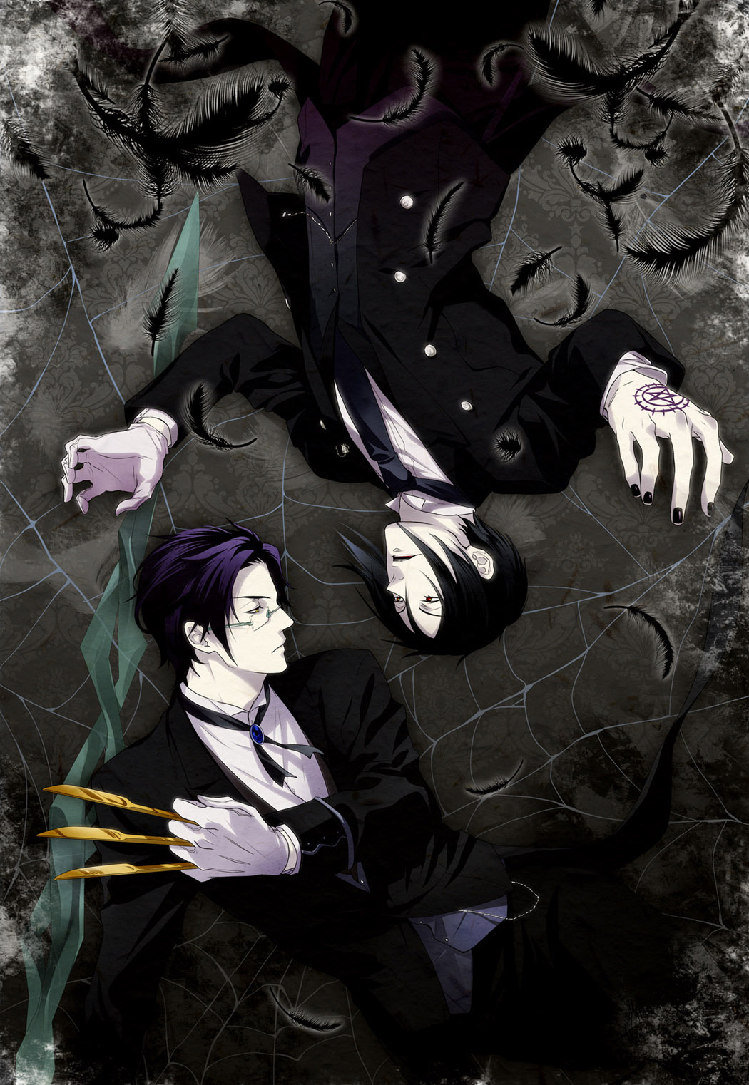 Description: Two people in suits and ties are laying on the ground with their hands in the air and one person holding a knife.