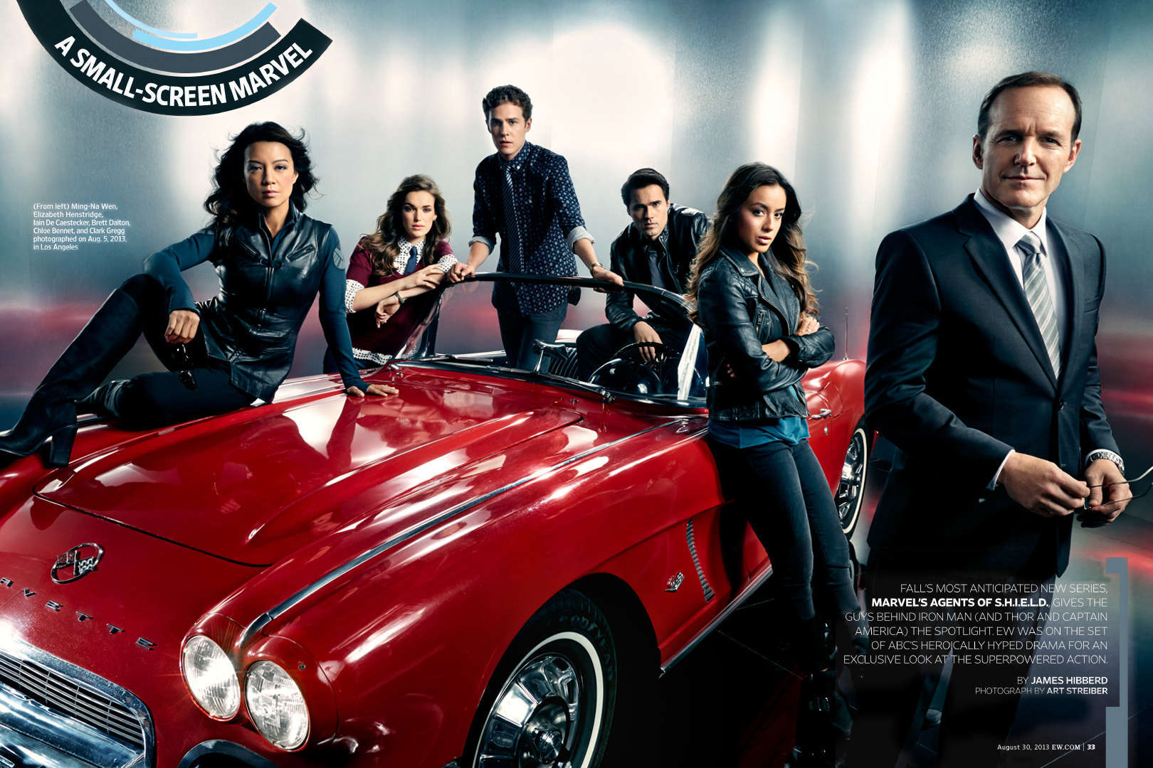 Description: A group of people standing around a red car in a movie poster for the tv series suits and ties.