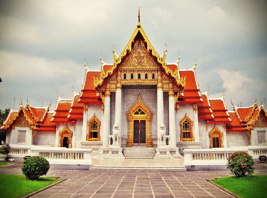Description: A large building with a red roof and white pillars and a gold and white door and windows on the front.