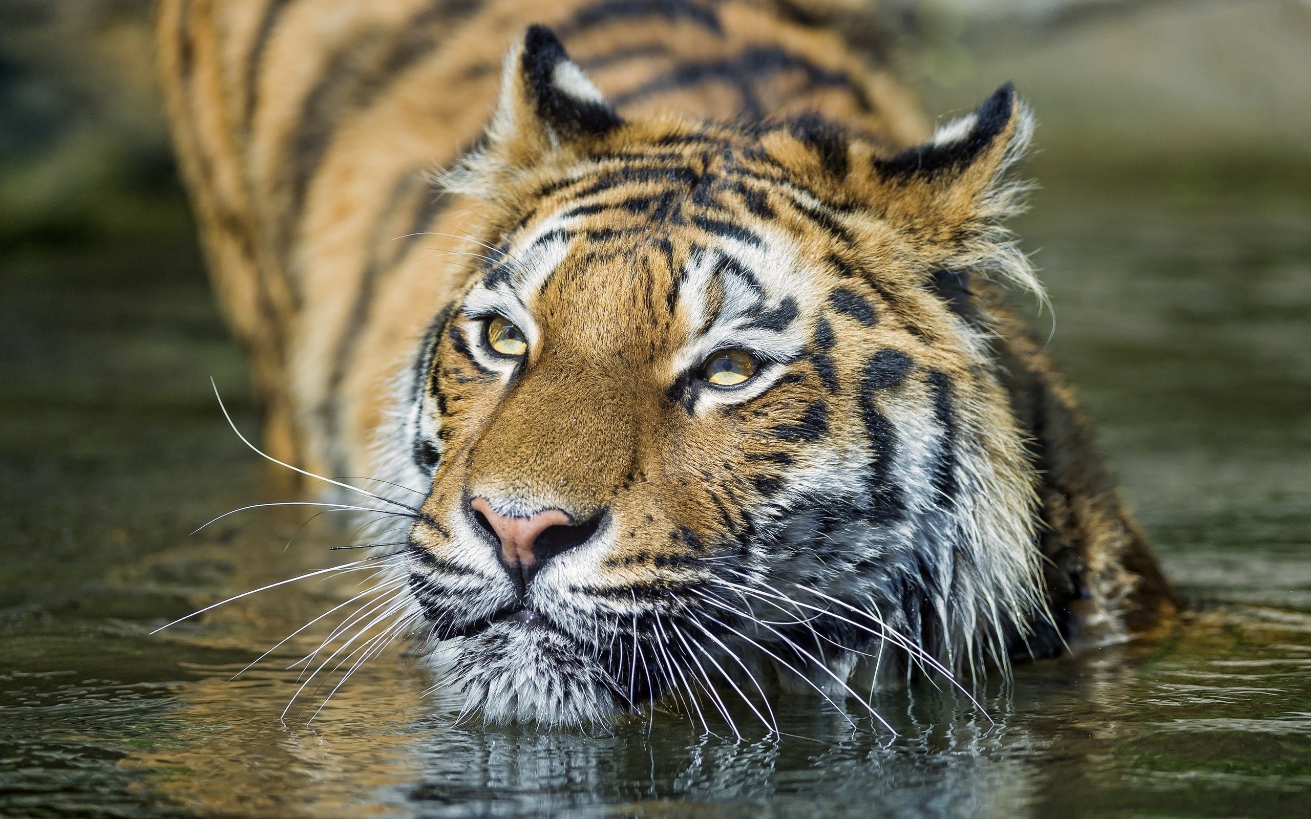 Description: A tiger walking through a body of water with its head in the water and looking at the camera with a serious look on its face.