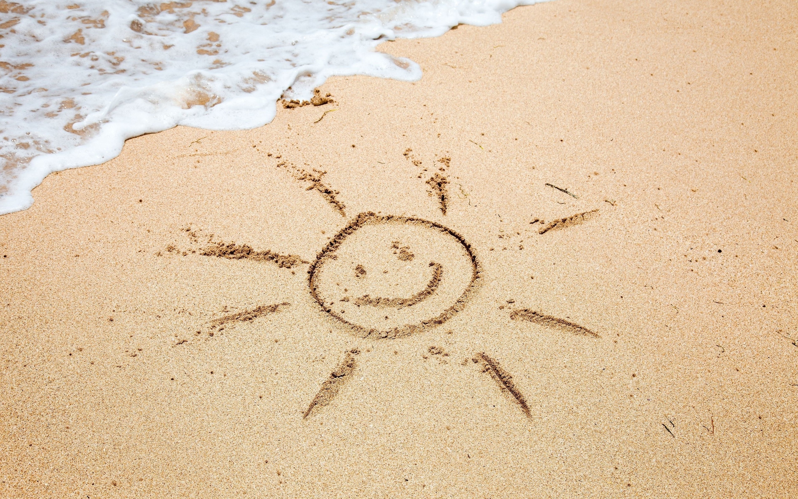Description: A drawing of a sun on the sand of a beach with waves coming in and out of the water.