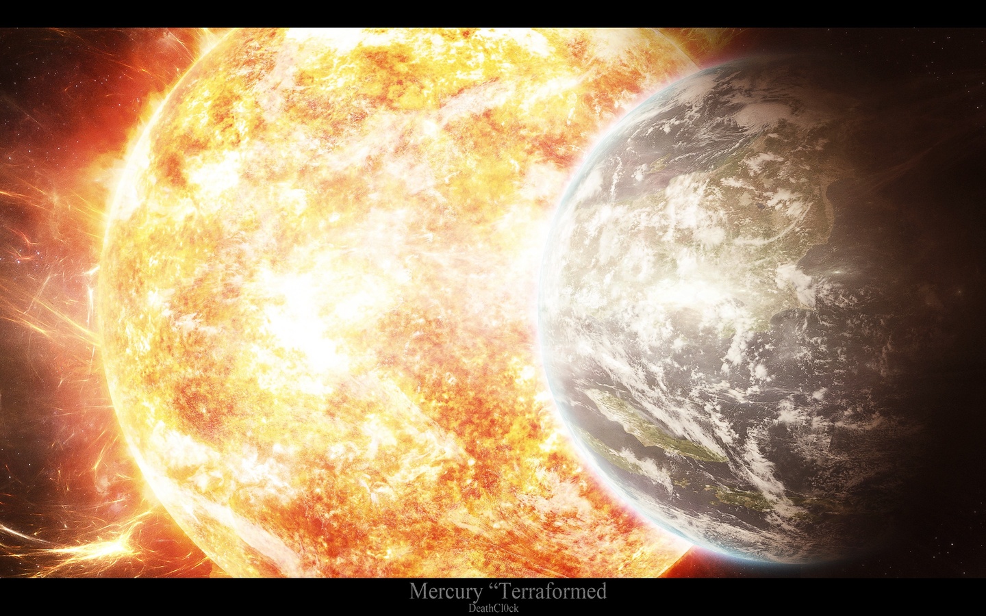 Description: A large sun and a small planet in the background with a black background and a white background with a black border.