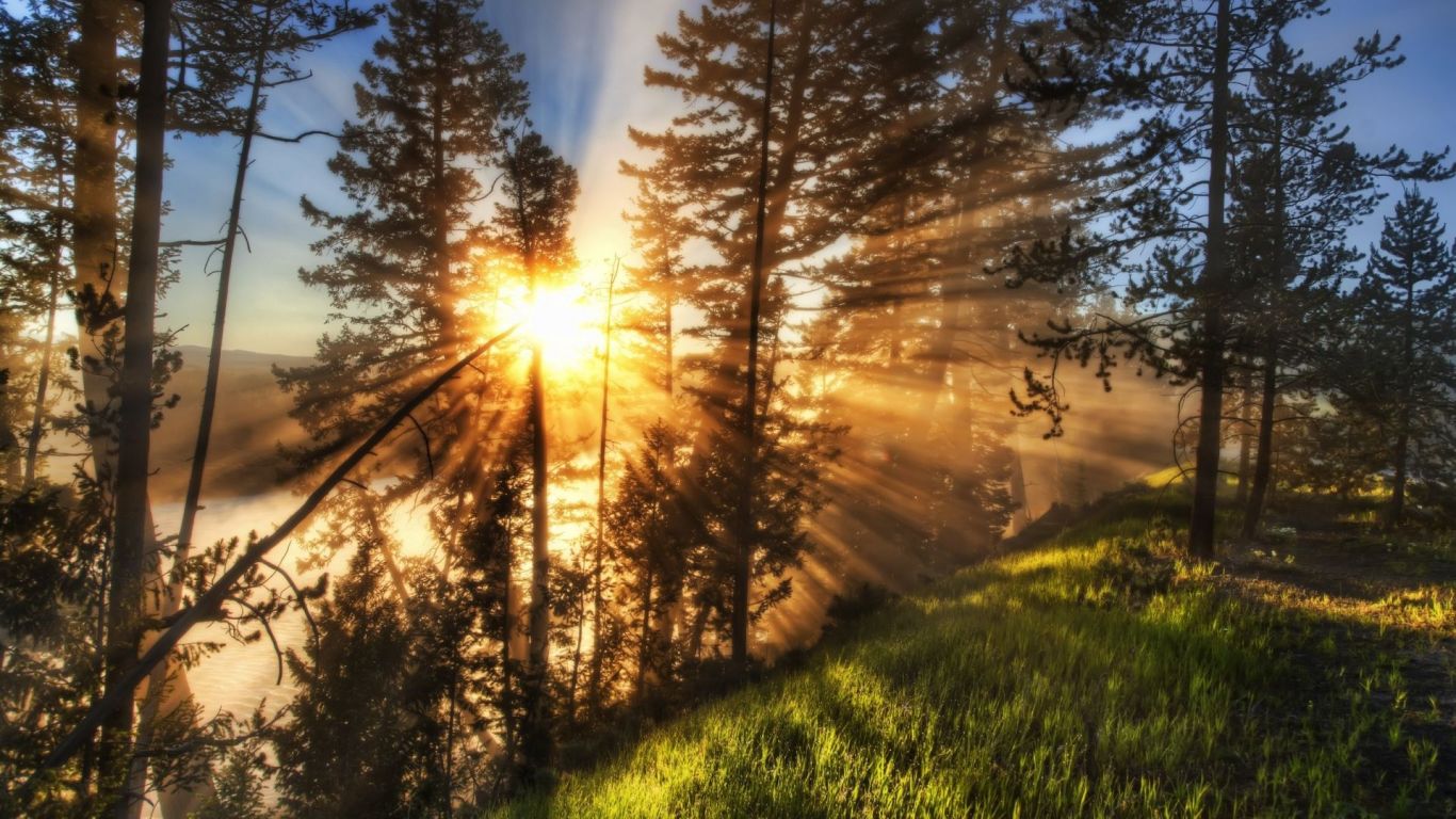 Description: A sunbeam in the middle of a forest with trees and grass on the ground and fog in the air.