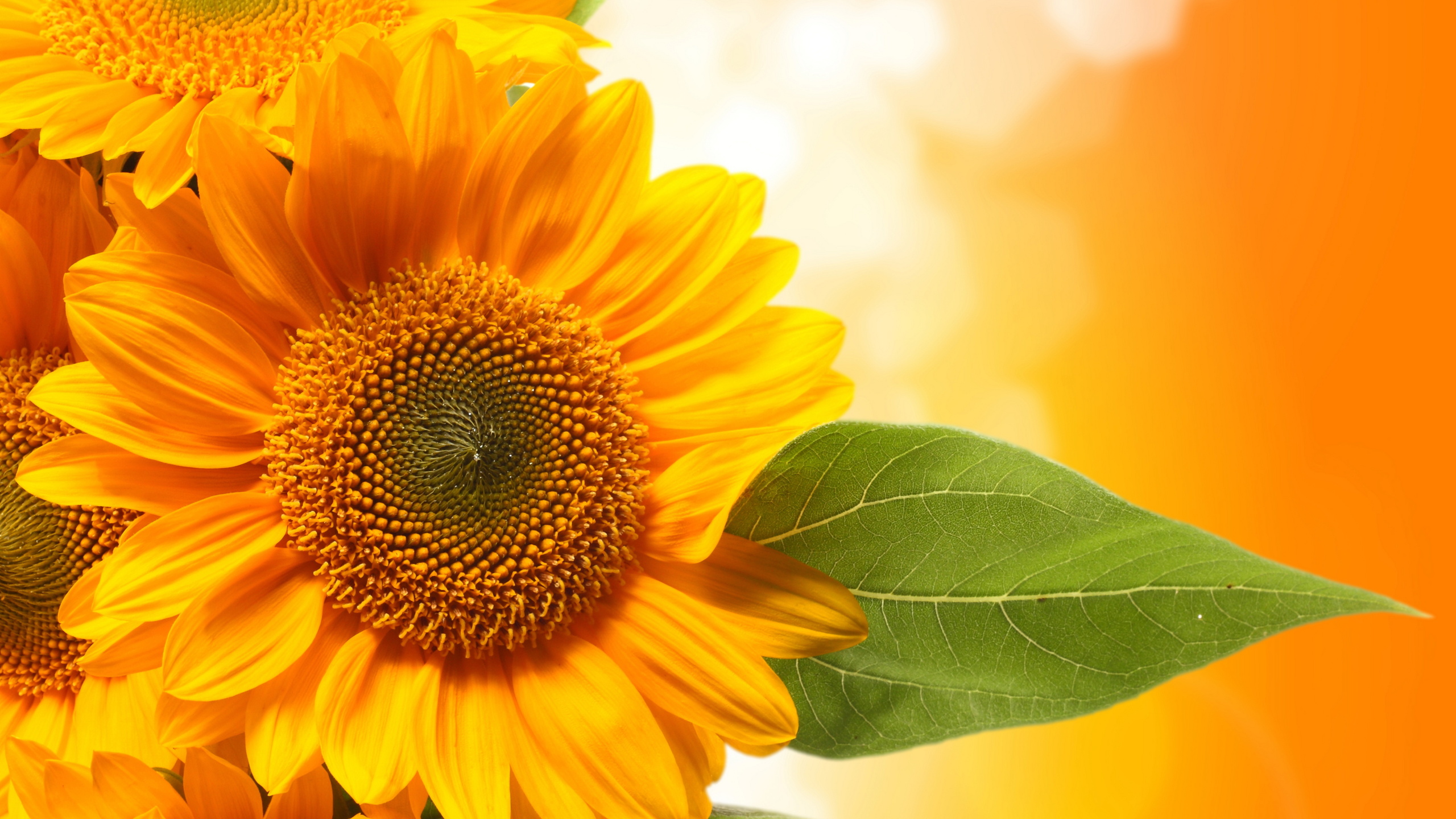Description: A close up of a bunch of sunflowers with leaves on a bright background with a blurry effect.