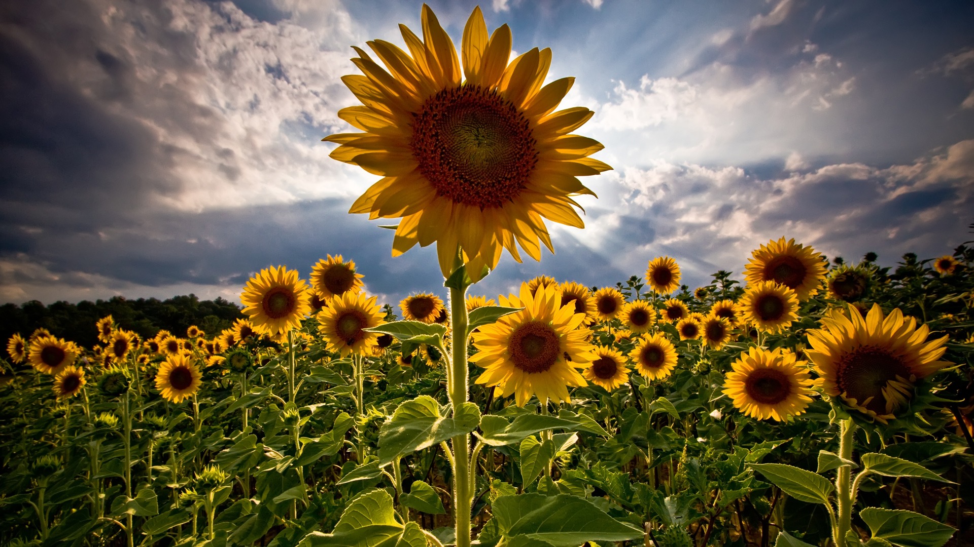 Description: A sunflower is in the middle of a field of sunflowers with a cloudy sky in the background.