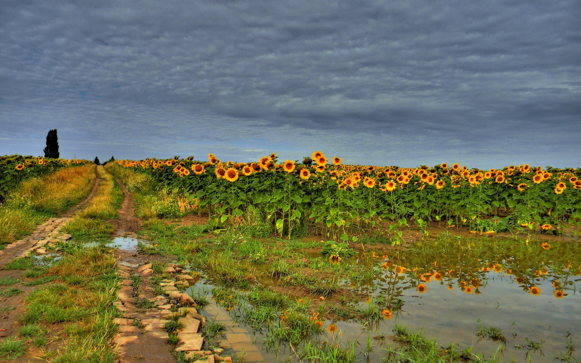 Description: A field of sunflowers with a path leading to them and a dark sky in the background with clouds.