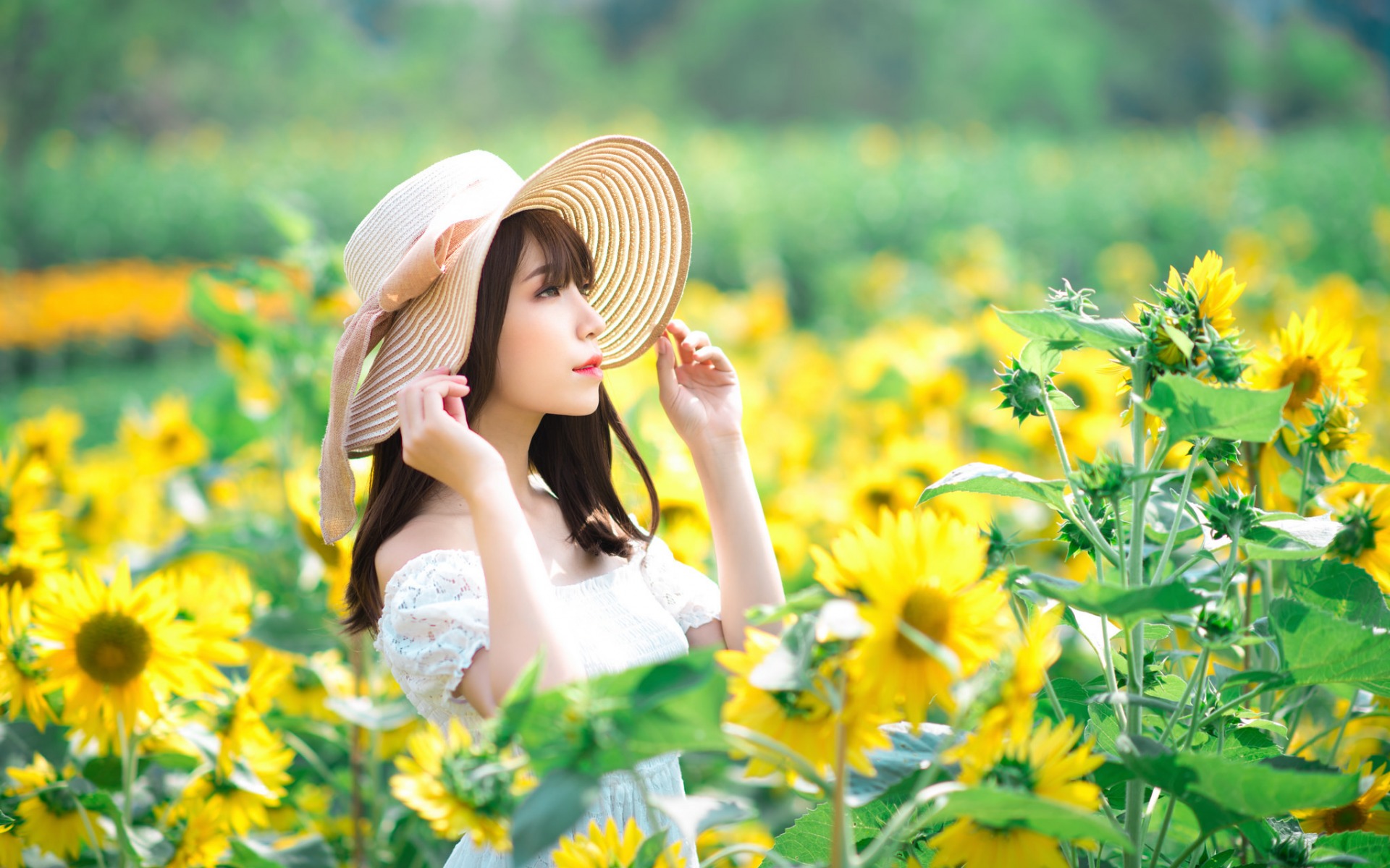 Description: A woman in a sunflower field with a hat on her head and a white dress on her shoulders.