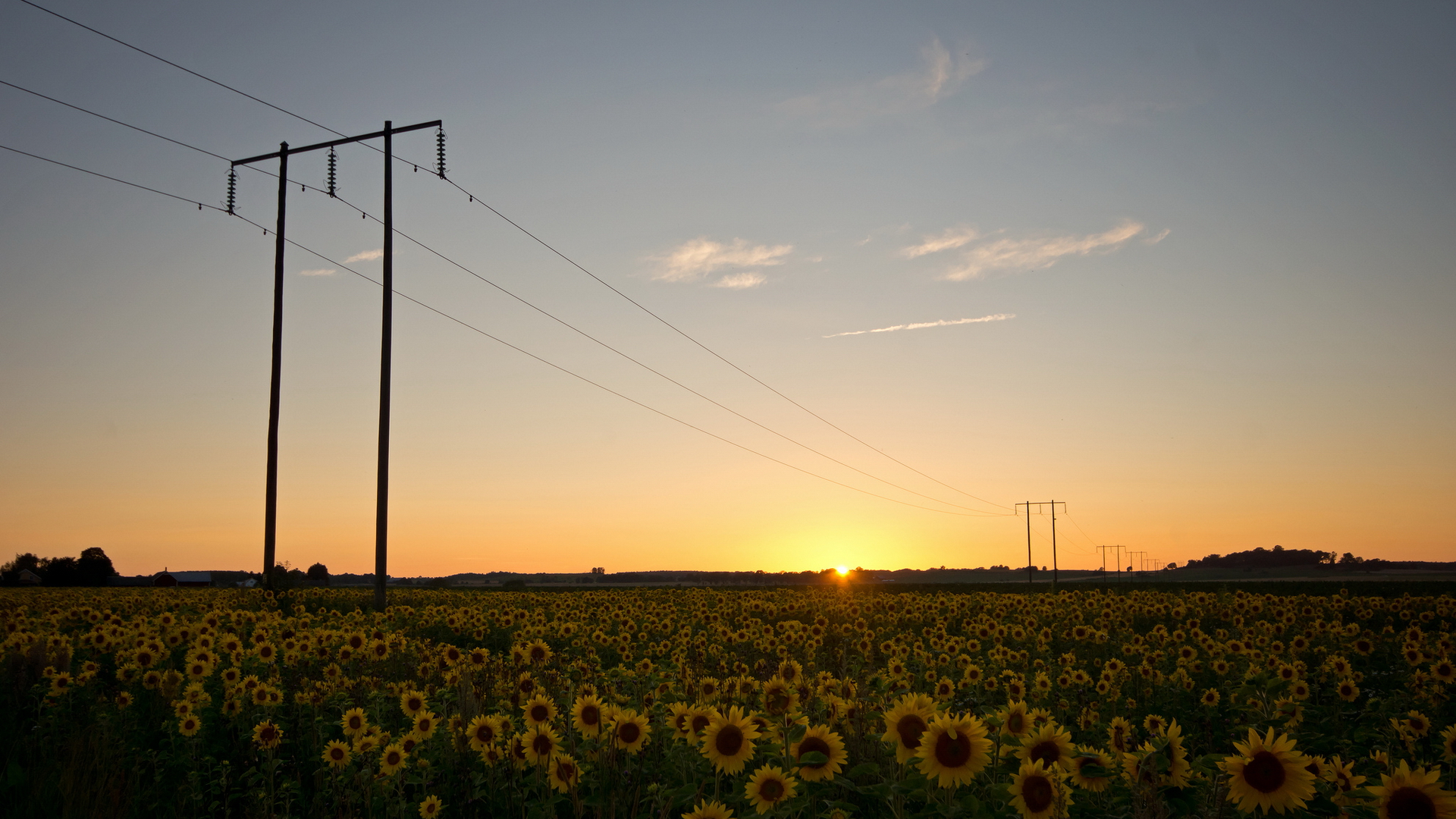 Description: A field of sunflowers with power lines in the background at sunset or dawn with a sun setting.