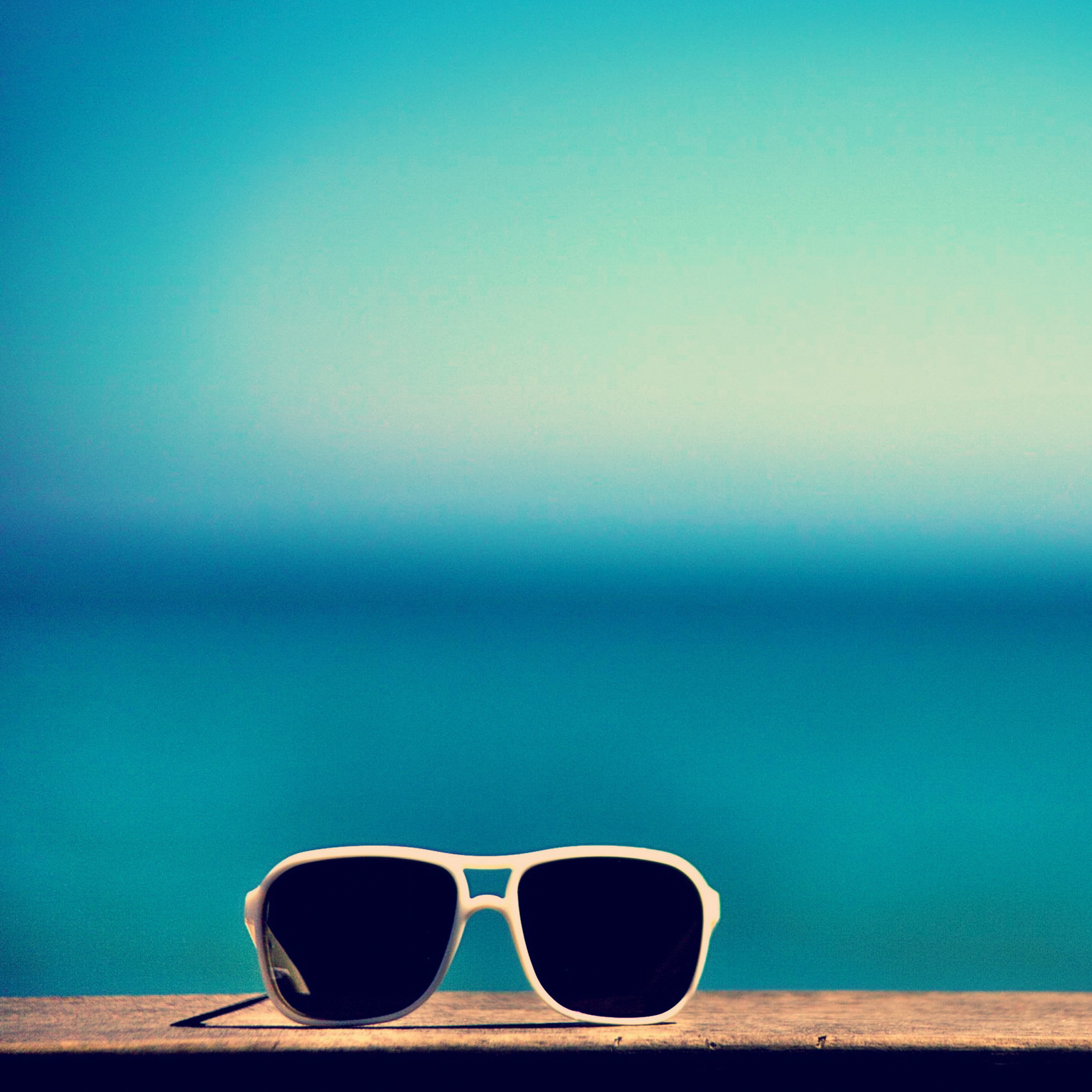 Description: A pair of sunglasses sitting on a ledge near the ocean with a blue sky in the background and a blue sky in the foreground.