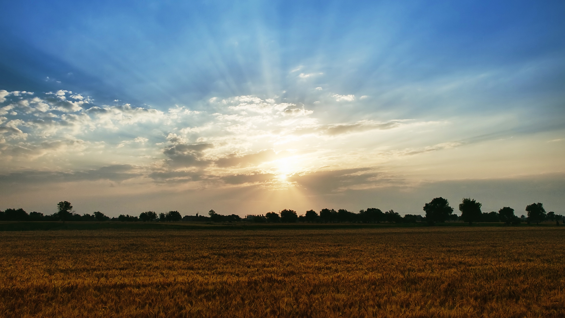Description: A field with a sky filled with clouds and sun shining through the clouds above it and a field of grass.